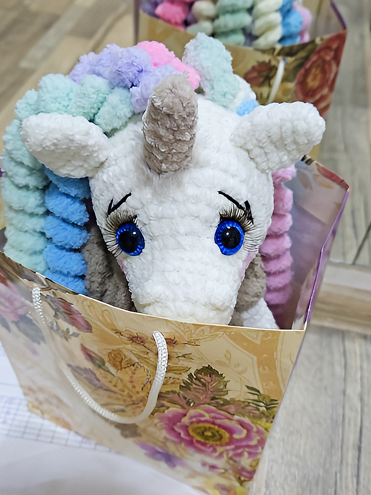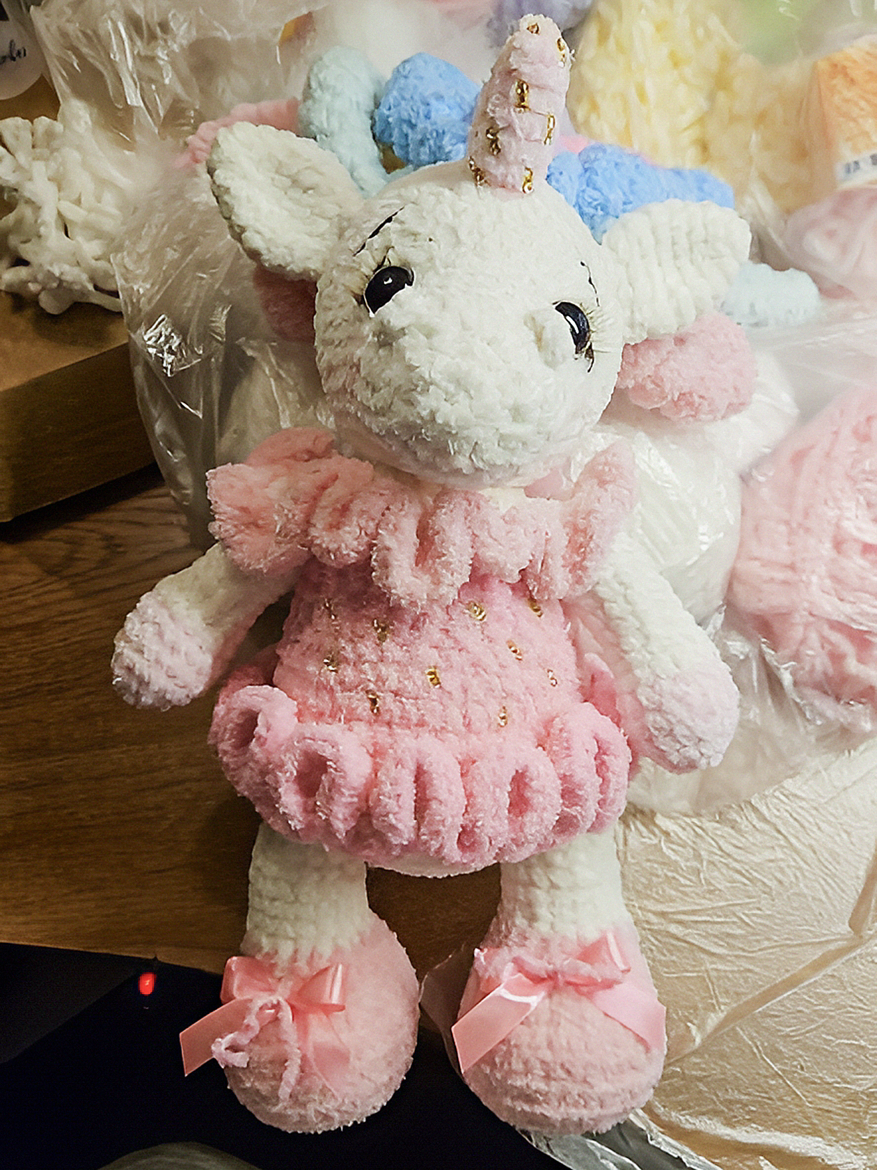 В этом году немного сэкономила на подарках детям друзей: вяжу каждой малышке по единорогу. Выходит дешевле, чем покупать или собирать сладкие подарки. В прошлом году я делала друзьям оленя.