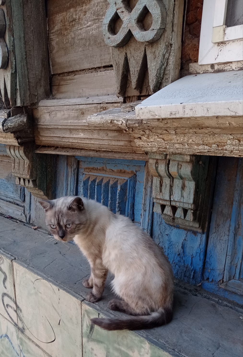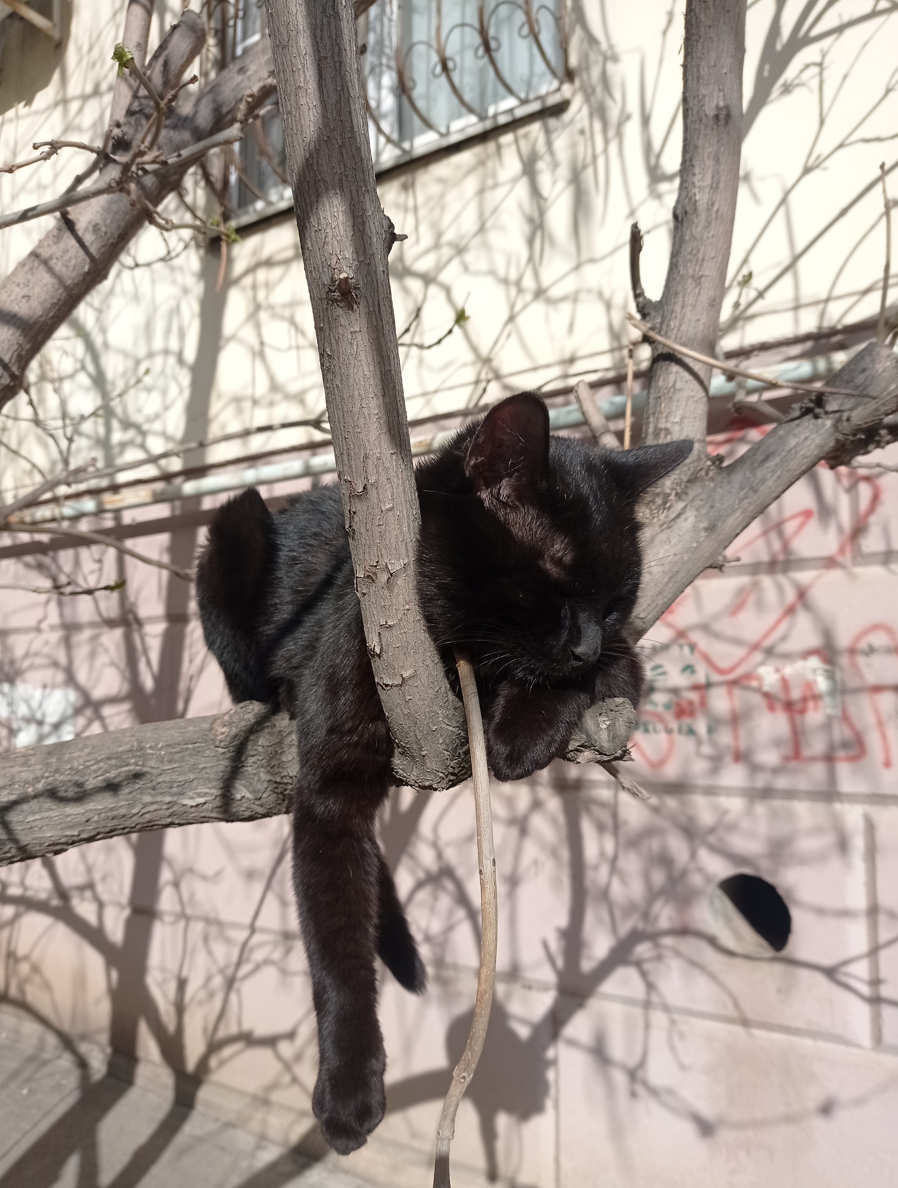 Как-то шли, увидели недовольного кота. А другой спит на дереве, главное,чтобы не упал:).