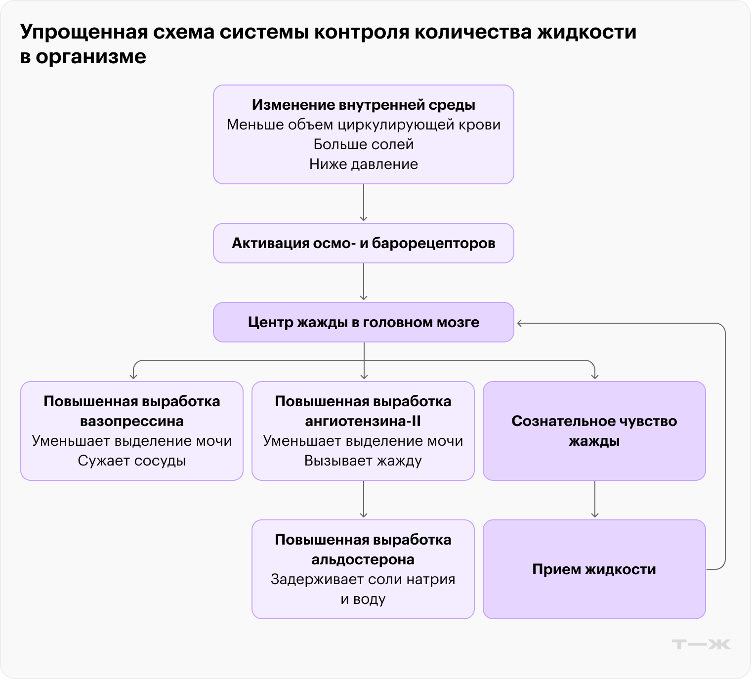 Когда в головной мозг поступает сигнал о недостатке воды, организм начинает ограничивать потерю жидкости с мочой. Для этого усиливается выработка некоторых гормонов, в основном вазопрессина, ангиотензина-II и альдостерона.