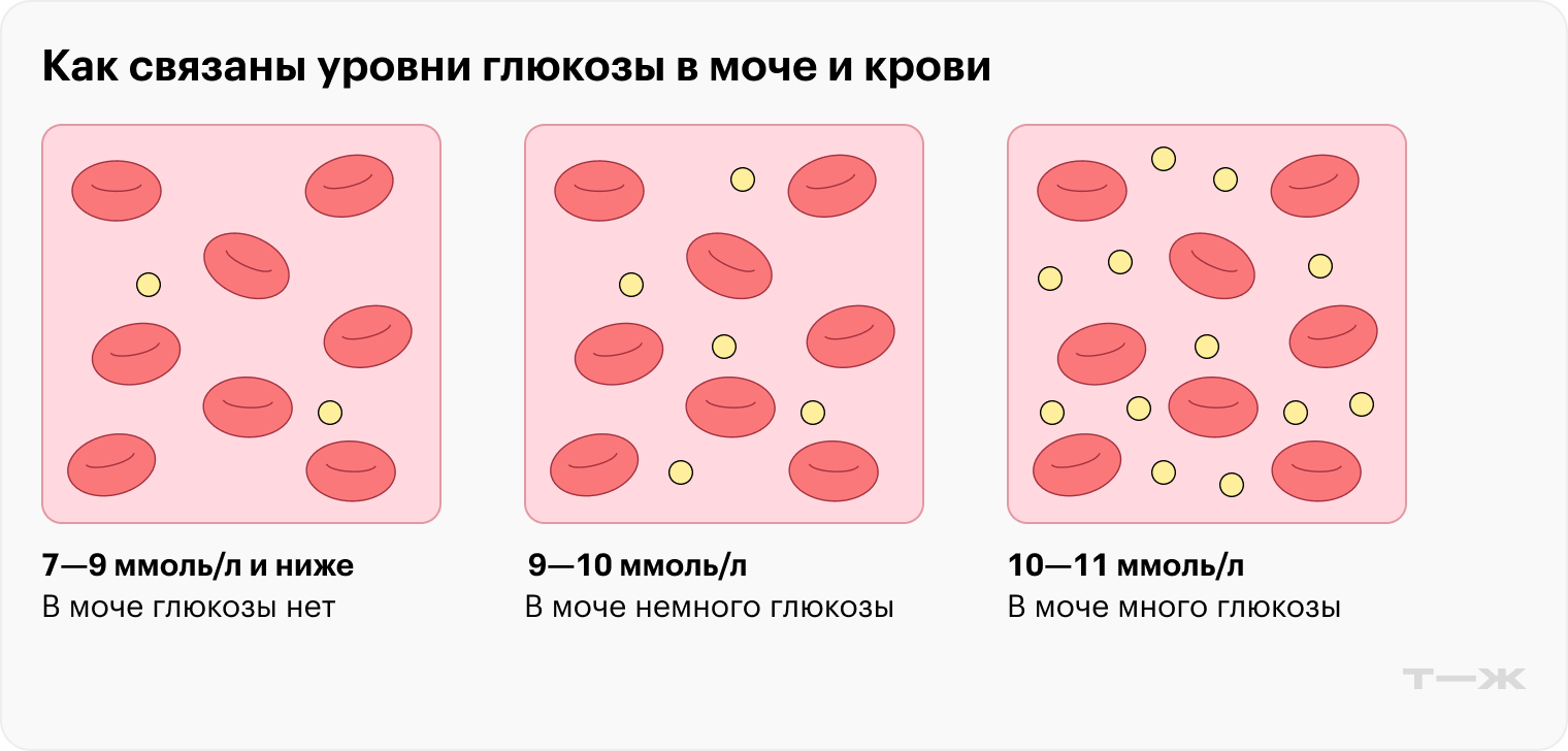 Диабет диагностируют при постоянно повышенном уровне глюкозы в крови натощак — от 7 ммоль/л и выше. А когда этот показатель превышает 10—11 ммоль/л, почки начинают выводить избыток сахара с мочой — это называют почечным порогом глюкозы. При этом уходит не только глюкоза, но и значительное количество жидкости, так как она тянет на себя воду.