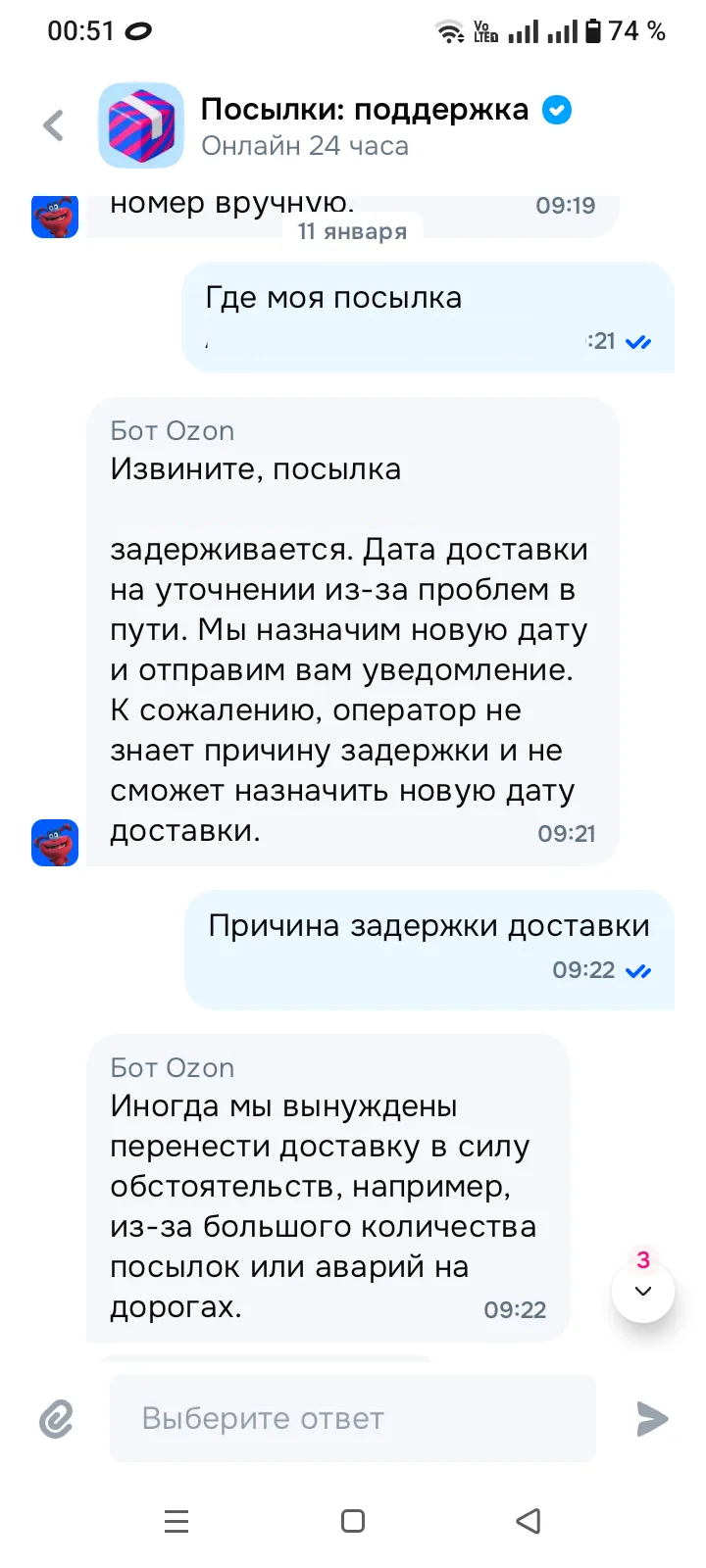 В поддержке на мои вопросы «где посылка» чат бот пишет одну и ту же отписку «посылка задерживается из за проблем в пути. К сожалению оператор не знает причину задержки и не сможет назначить новую дату».