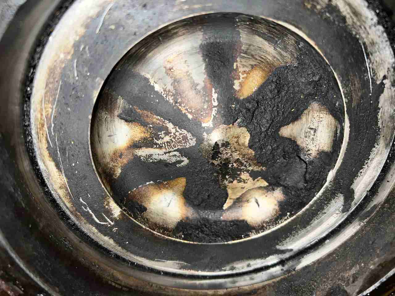 На головке поршня обнаружили трещины. При работающем насосе циркуляционное масло через них заполняло камеру сгорания.