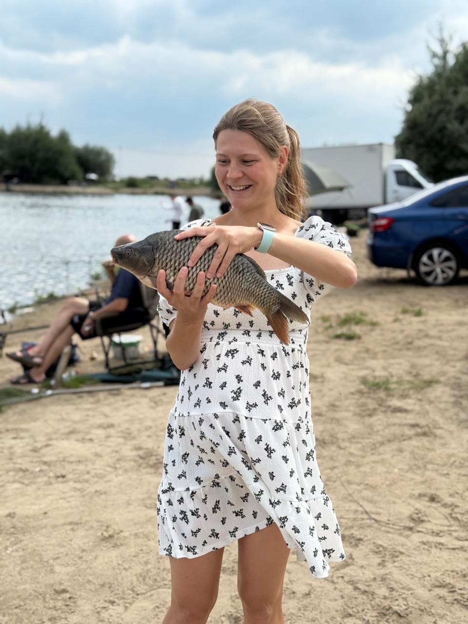 Но больше были позитивных моментов: я каждый день ходила в бассейн, проплывала по 2,5-3 километра, много гуляла. Ездила на конференцию в Санкт-Петербург и на свадьбу подруги в Чебоксары. С мужем несколько раз ездили на рыбалку. Однажды ездили с мужем на платную рыбалку на карпа. Приехала машина на зарыбление, двое парней выпустили рыбу, а несколько рыбин упали мимо пруда, один парень их выловил сачком, стоял и думал, что с ними делать, а тут я рядом стояла и наблюдала, он решил мне отдать самую крупную рыбину 😀