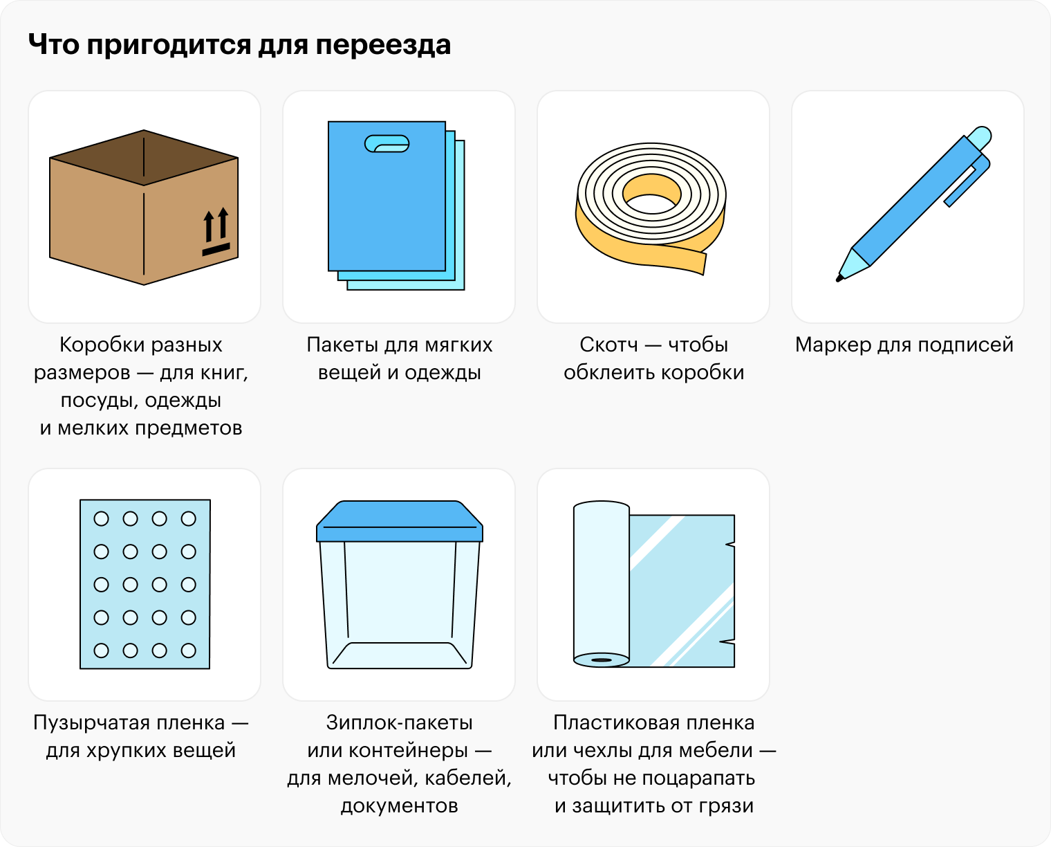Чтобы сложить куда-то одежду, книги или посуду, нужно подготовить коробки, пакеты, скотч, пленку для хрупких предметов. Собрали в список все, что может пригодиться для переезда. Вы можете сохранить его в формате PDF или отправить себе в телеграм-сообщении.