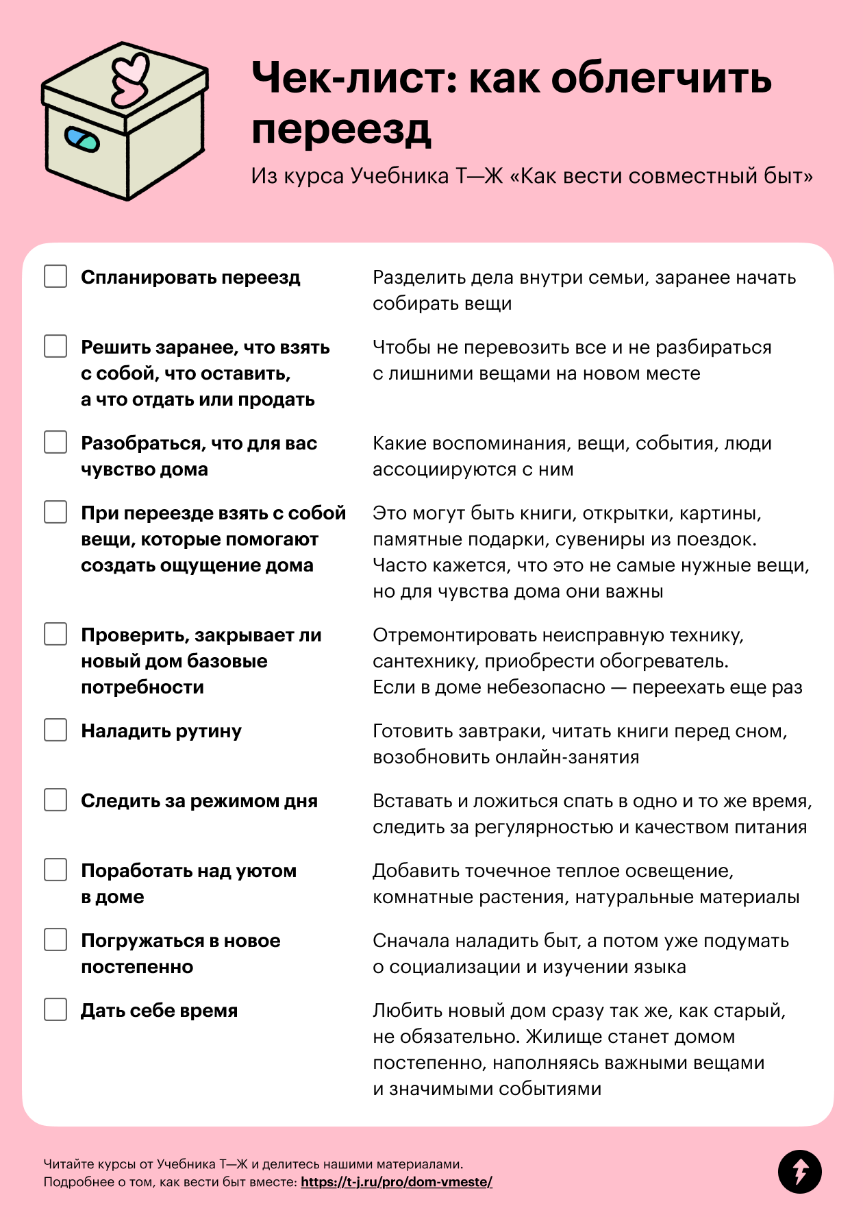 В этом уроке разберемся, как организовать переезд так, чтобы остались силы его отпраздновать. А еще поговорим, как подготовиться к нему психологически, а потом адаптироваться на новом месте и почувствовать себя дома, даже если поначалу все кажется чужим.