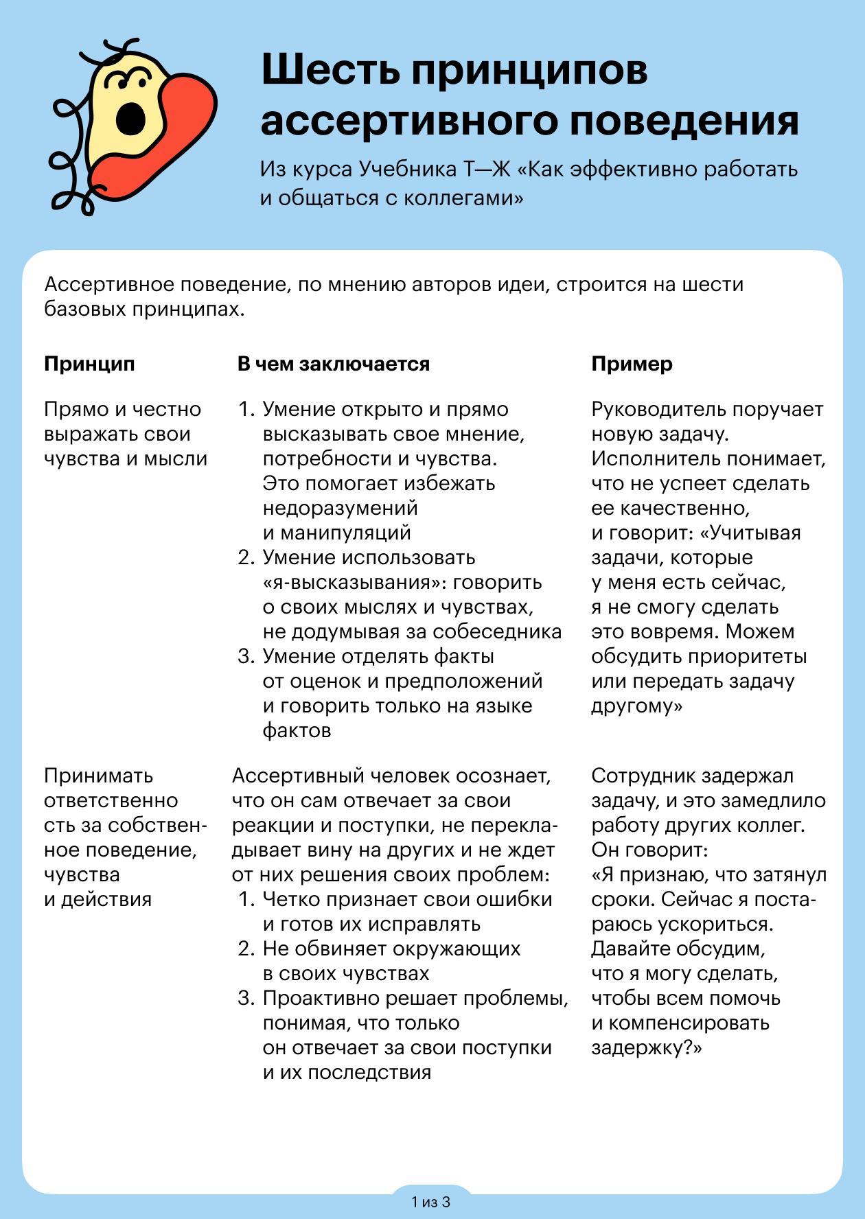 В этом анализе поможет наша рабочая тетрадь — вы можете скопировать ее в «Гугл-документах» или скачать в формате DOCX. Если регулярно ее заполнять и отвечать на вопросы, вы сможете понять, как обычно проходит ваша коммуникация с людьми и что нужно сделать, чтобы ваше поведение постепенно стало ассертивным.
