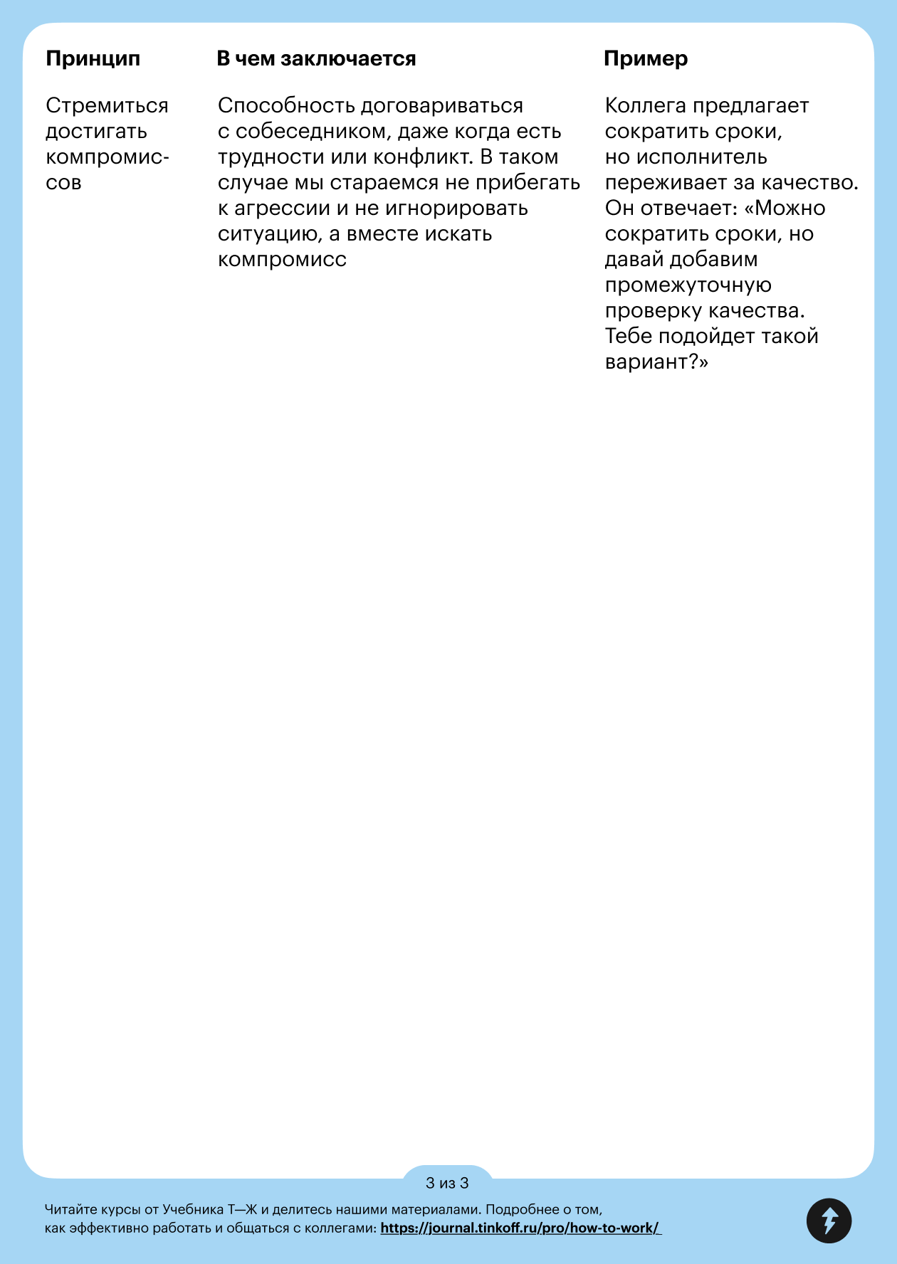 Мы подготовили памятку, в которой подробнее описали, в чем заключается каждый принцип и как он может раскрываться в рабочих ситуациях. Ее можно скачать в формате PDF или отправить себе в телеграм-сообщении.