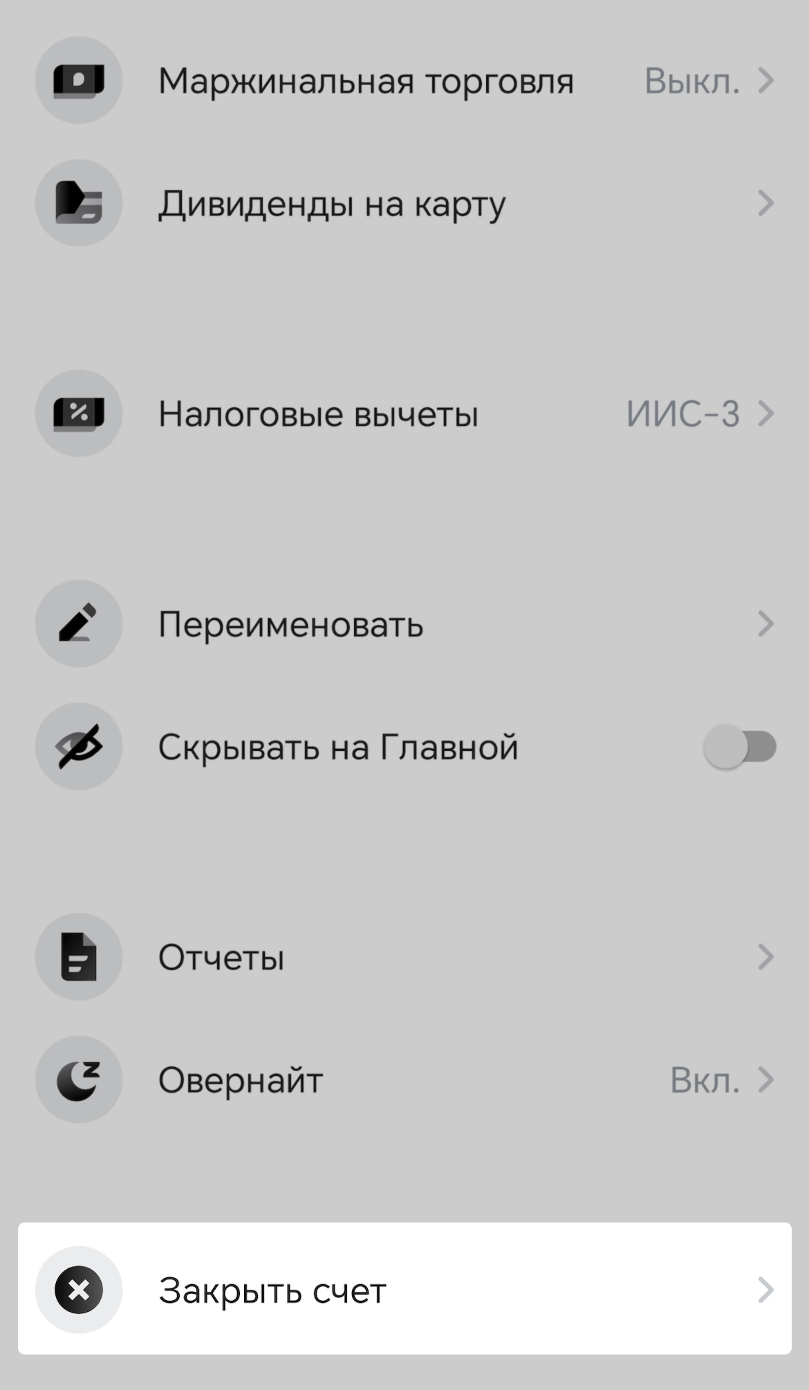 - С телефона — в приложении Т-Инвестиций или веб-приложении для Айфонов. На вкладке «Главная» нажмите на ИИС → на экране выбранного счета в правом верхнем углу нажмите на значок шестеренки → выберите «Закрыть счет».