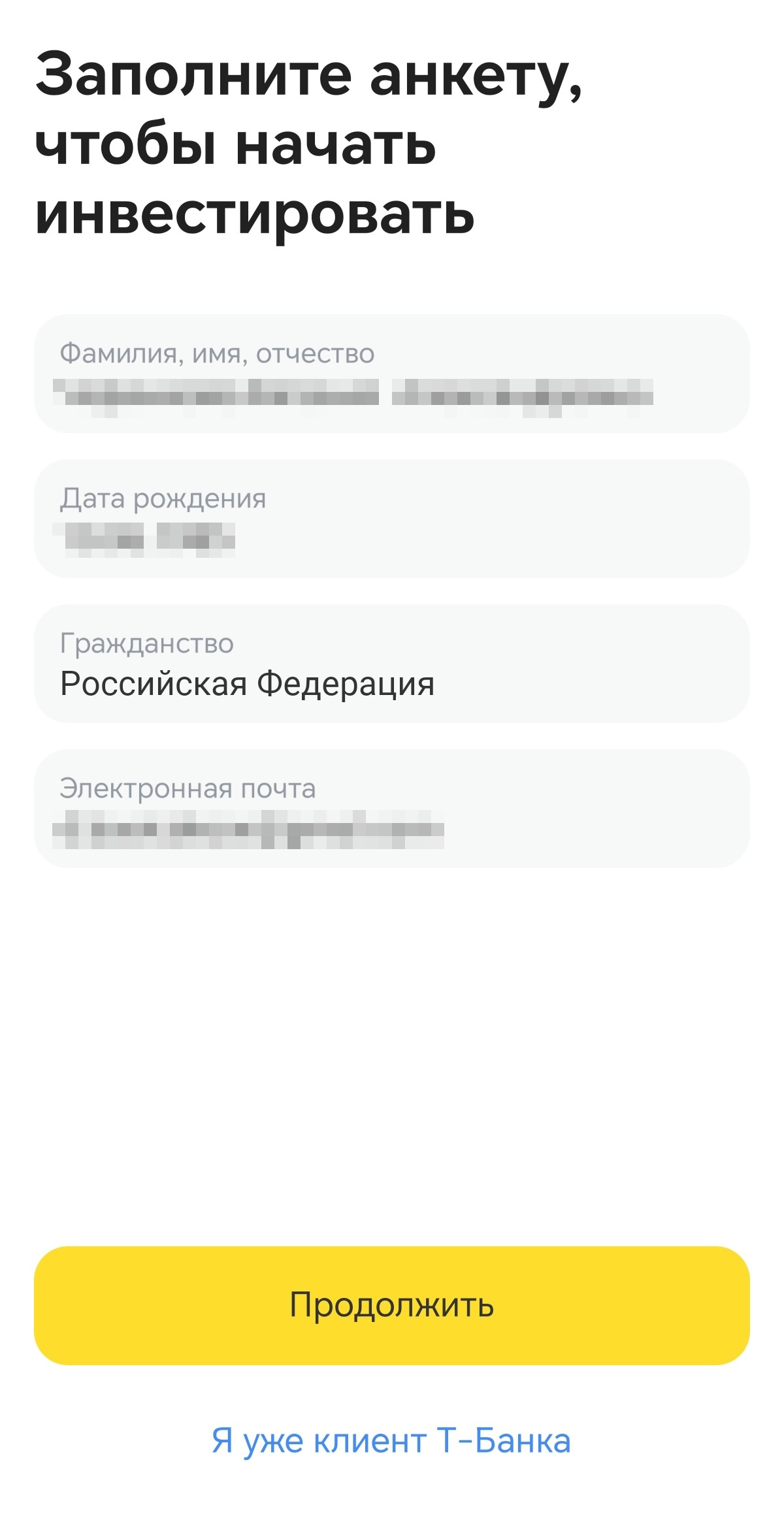 В остальных случаях у вас могут запросить дополнительную информацию, например паспортные данные. В Т-Инвестициях для открытия счета новому клиенту понадобится только паспорт гражданина РФ, в редких случаях — ИНН, если компания не сможет узнать его по паспортным данным.
