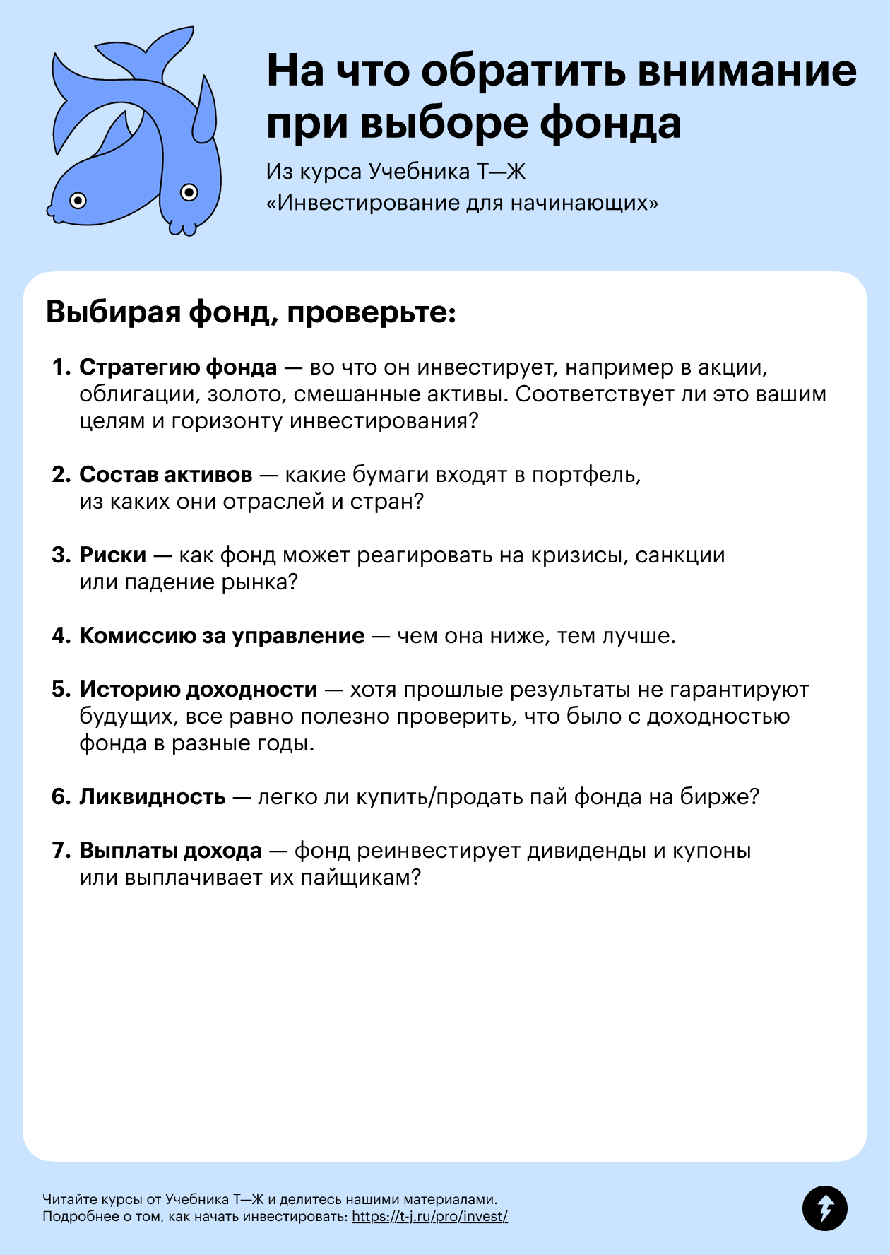 Напоследок собрали для вас памятку: на что обратить внимание при выборе фонда. Скачайте ее на свое устройство в формате PDF или отправьте себе в телеграм-сообщении.