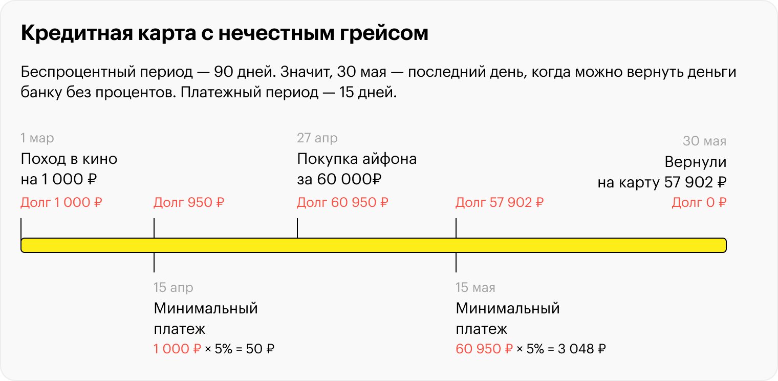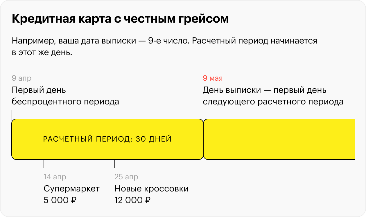 У карт с честным грейсом всегда есть запас времени для оплаты задолженности даже по самым поздним покупкам — как минимум 10—25 дней.