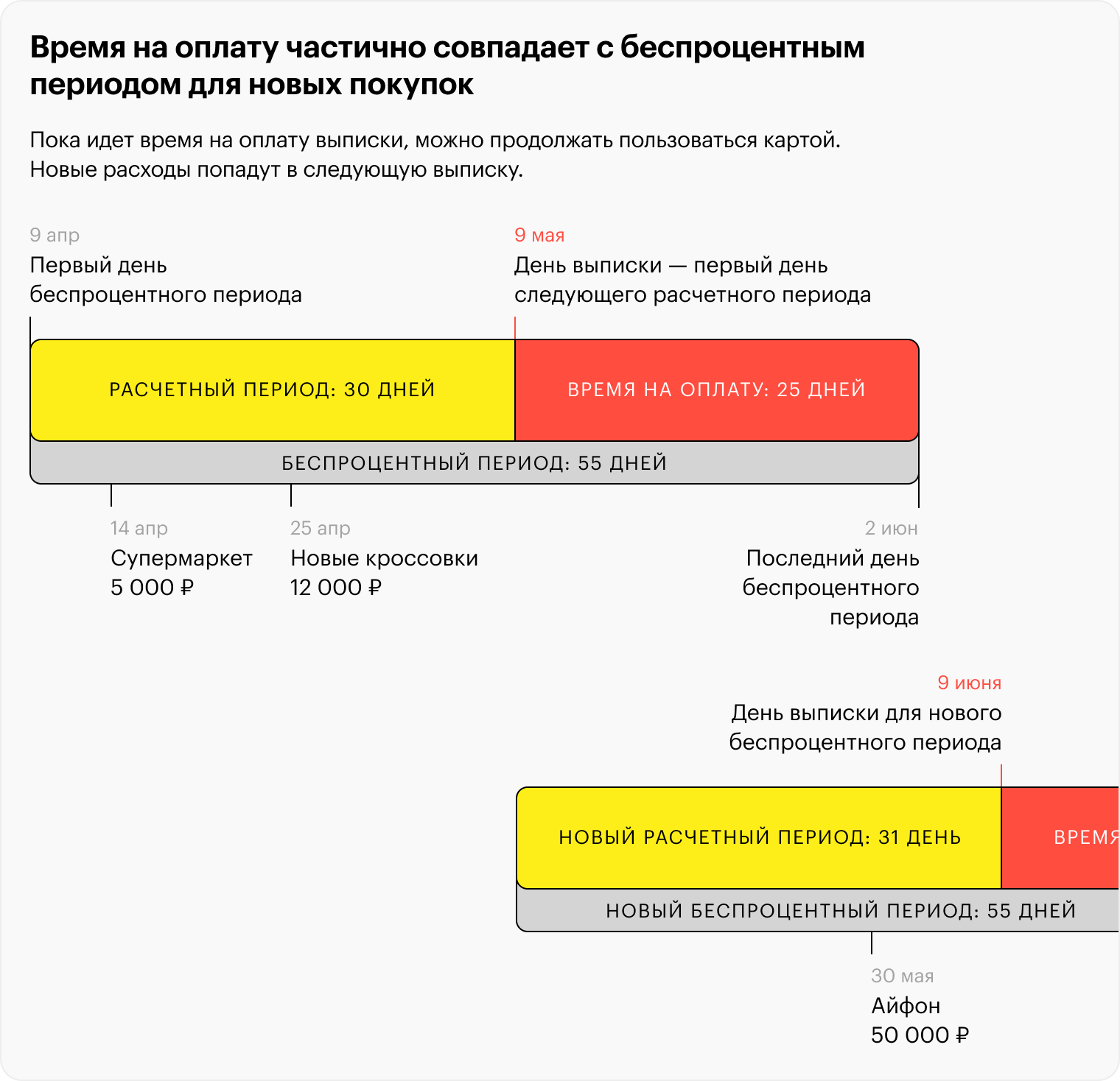 Если вы купите что-то 10 апреля — на следующий день после выписки, — на эту покупку будет максимальный беспроцентный период: эта трата попадет в выписку только через 30 дней, а потом еще 25 дней у вас будет на оплату. Итого 55 дней можно не возвращать деньги.
