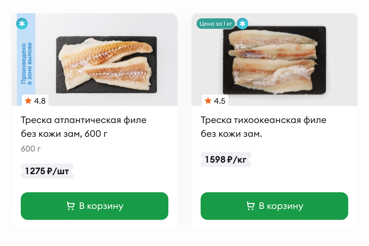 - посчитать стоимость всей трески за 1 кг;