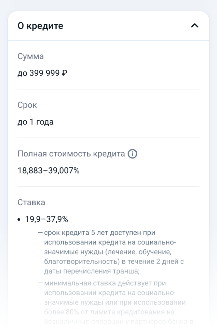 Сейчас банки обязаны сразу указывать, как меняется процентная ставка по кредиту, — даже в рекламе. Если они указывают минимальную ставку, то должны писать и максимальную, чтобы не вводить клиента в заблуждение. Ниже — пример с кредитом от Т-Банка.