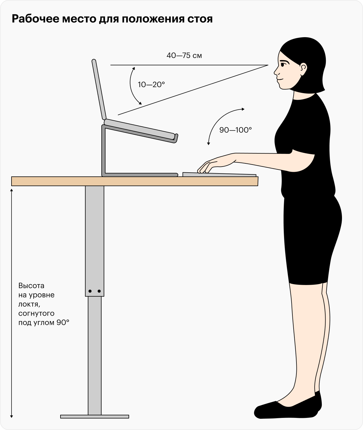 Напомним, как лучше обустроить место для работы стоя: стол должен быть на уровне согнутого локтя, монитор — на уровне глаз. Так вы не будете сутулиться и напрягать шею.