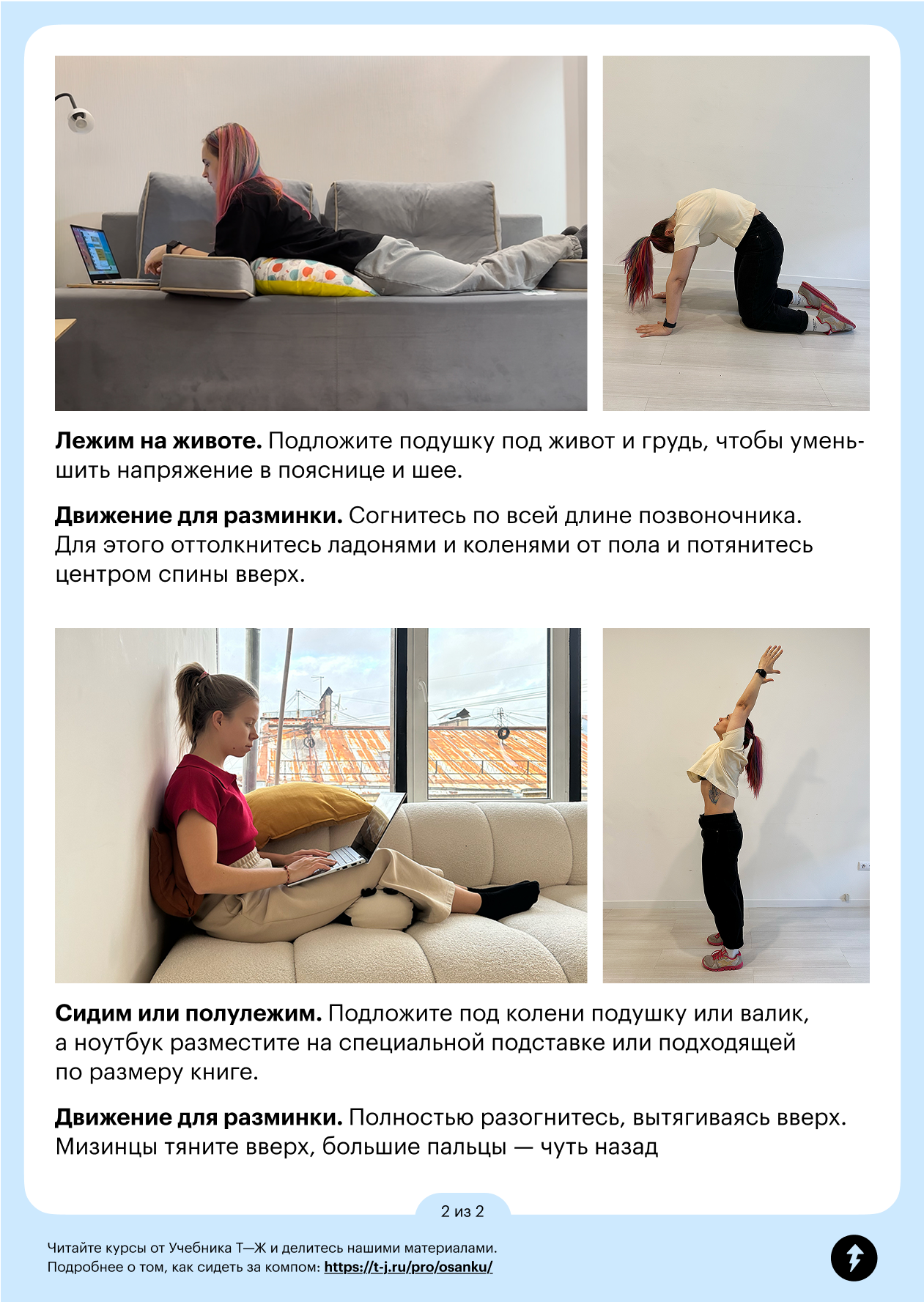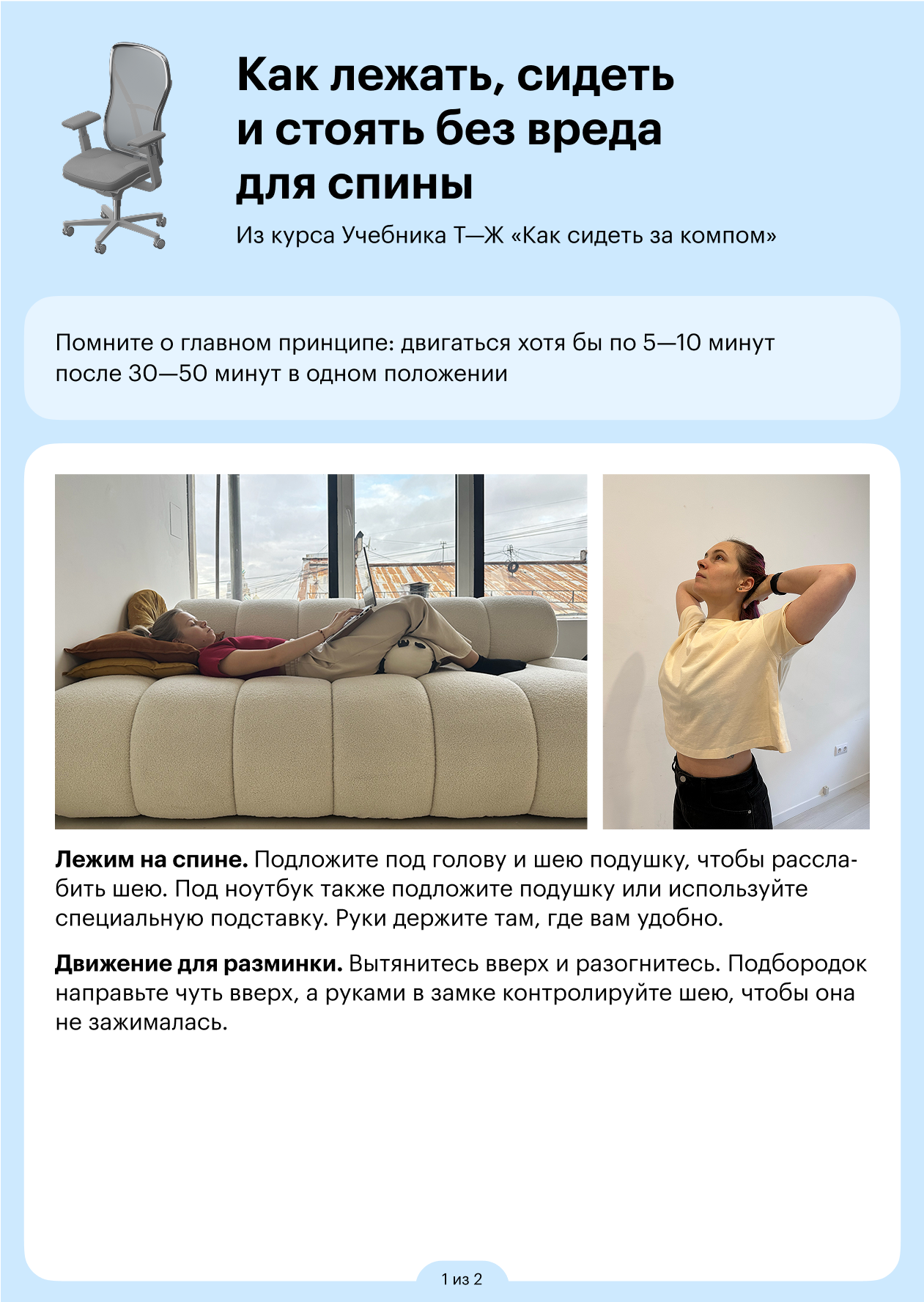 Собрали памятку с советами из урока о том, как работать и разминаться в разных положениях. Вы можете скачать ее в формате PDF или отправить себе в телеграм-сообщении.