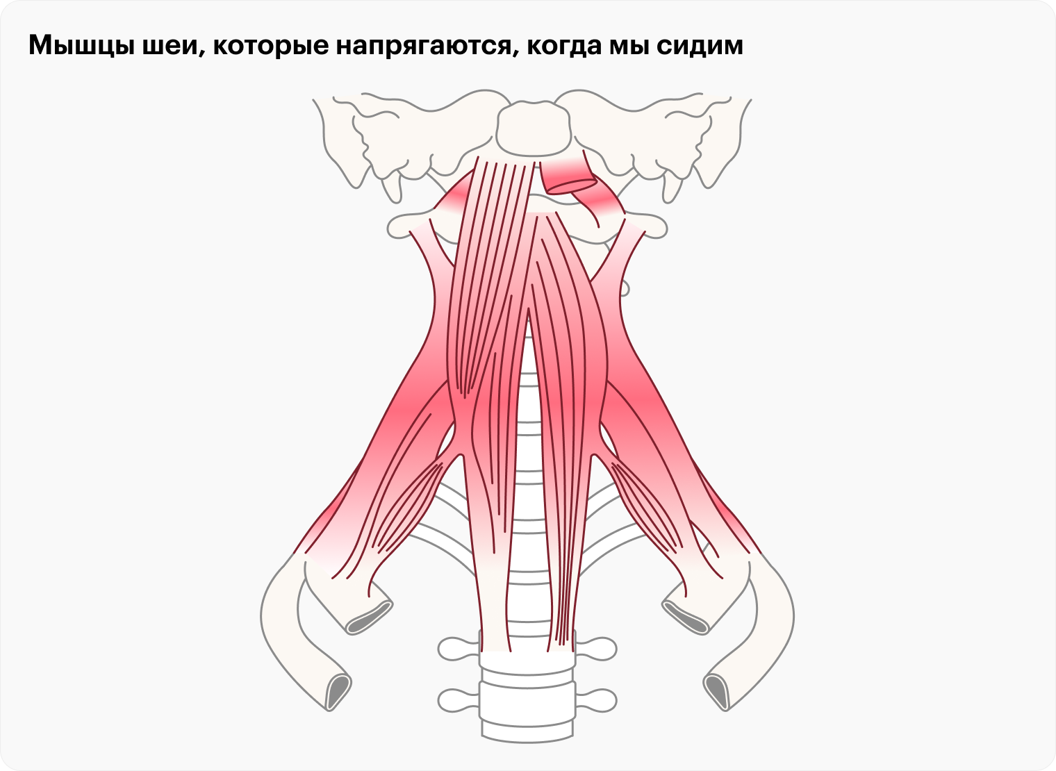 Когда напрягаются мышцы. В положении сидя мы часто вытягиваем голову вперед. Из-за этого возникает напряжение мышц на задней стороне шеи — оно может даже вызвать головную боль (сайт недоступен из РФ).