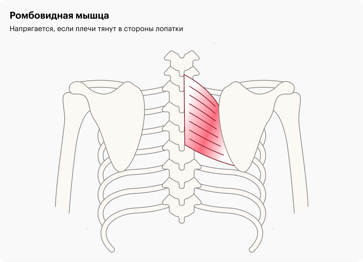 Сутулые и опущенные плечи тянут лопатки в стороны от позвоночника, и ромбовидные мышцы чрезмерно напрягаются, сопротивляясь этому.