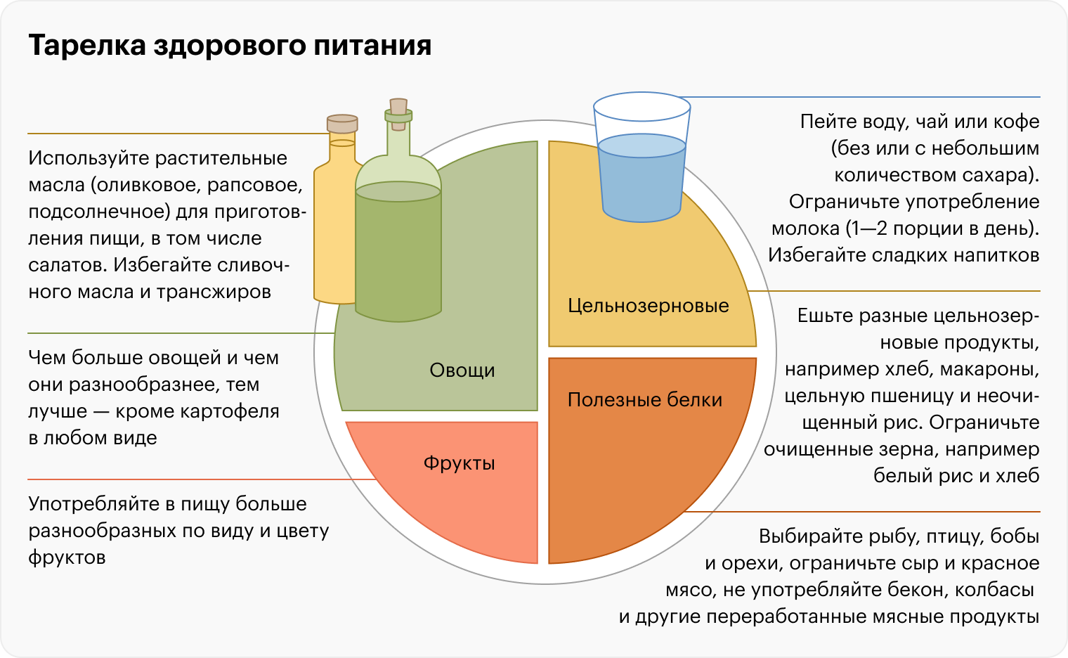 🥦 Половина тарелки — овощи и фрукты. Могут быть любыми — тушеные, свежие, жареные, замороженные.