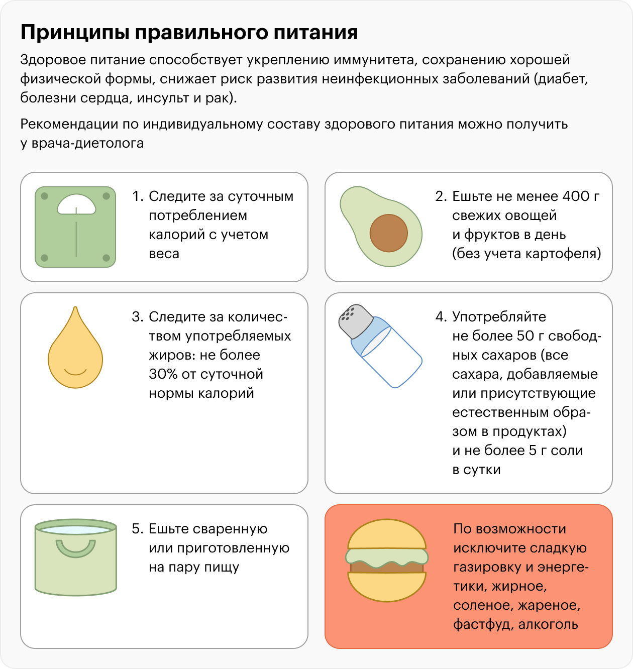 - Важно придерживаться принципов здорового рациона: питаться разнообразно, есть больше овощей и фруктов, меньше соленого, сладкого, жареного.