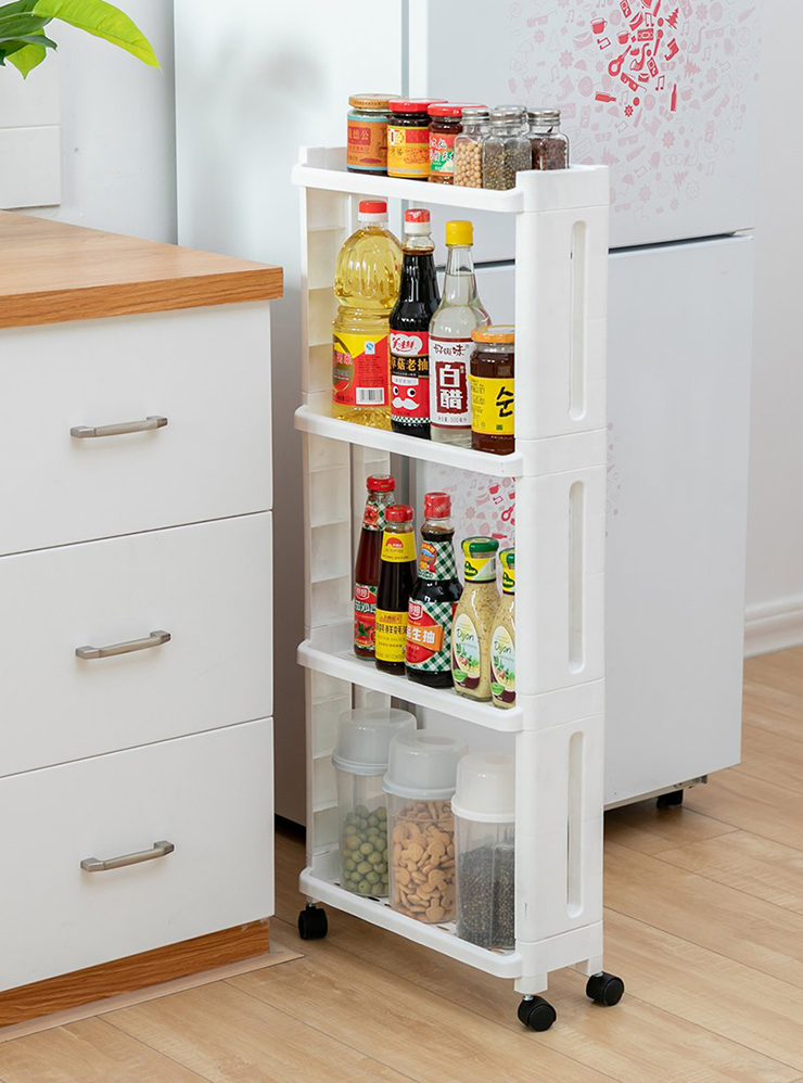 Это место подойдет для хранения плоских вещей: гладильной доски — в спальне, противней — на кухне. В ванной или на кухне можно установить узкую этажерку с бытовыми мелочами.