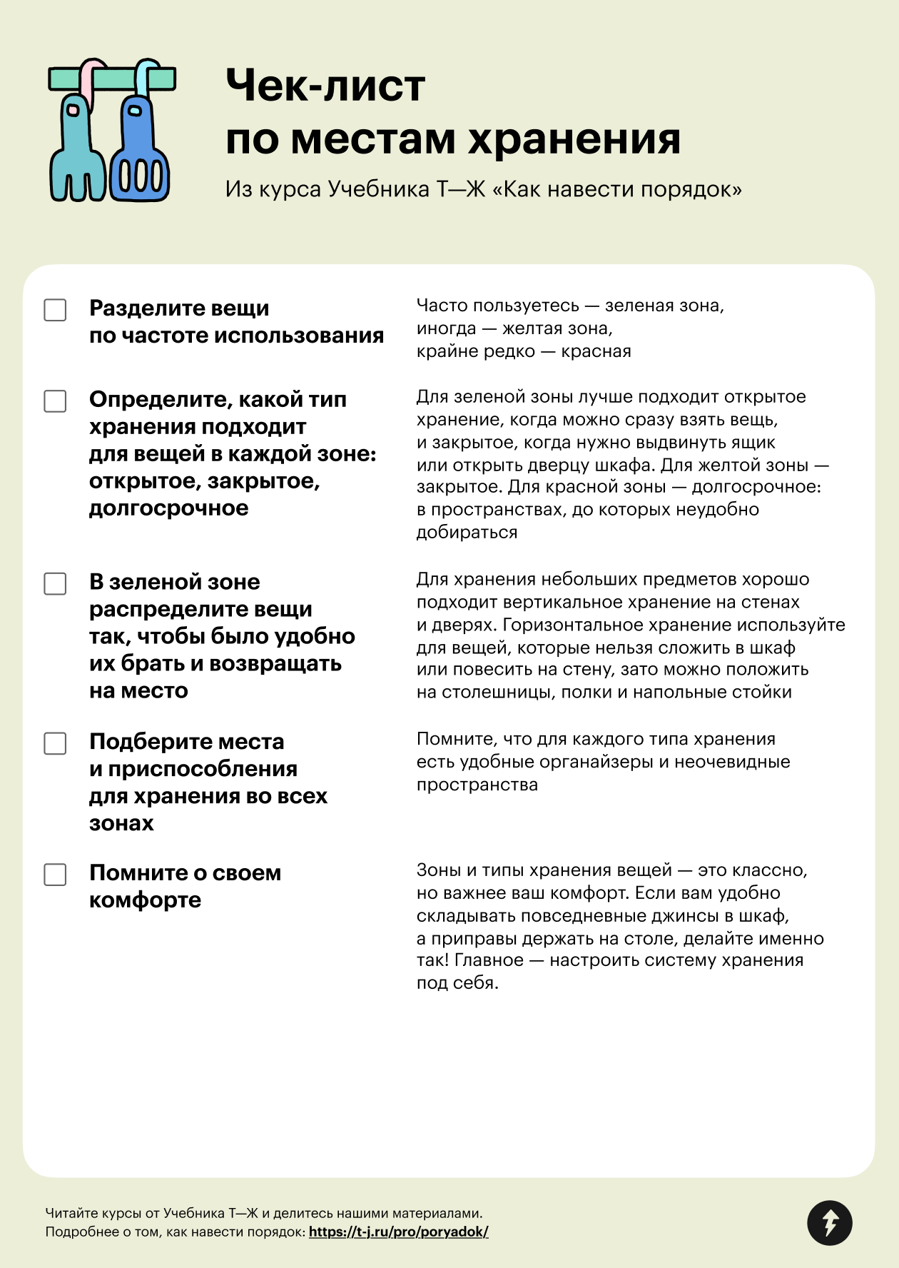Чтобы порядок держался, важно не только избавиться от лишнего, но и найти удобные места для хранения. А потом — сложить вещи так, чтобы их было легко брать и возвращать обратно. В этом уроке мы расскажем о пространствах и приспособлениях для хранения. А в следующем — как складывать вещи, чтобы порядок сохранялся надолго.