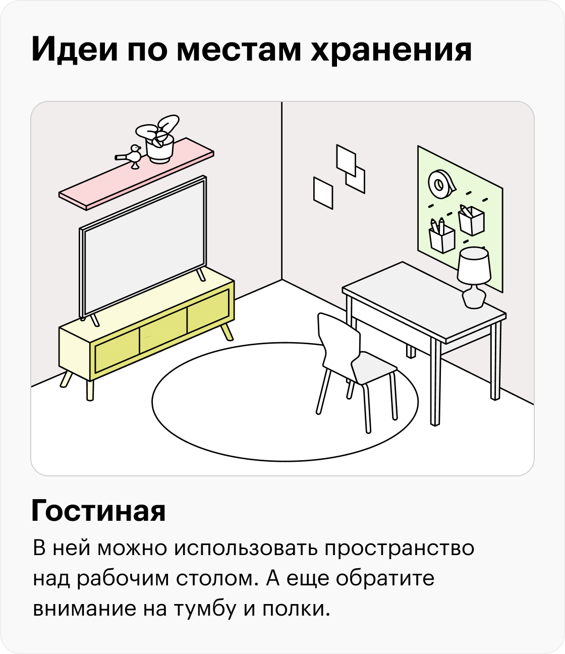 Теперь вы знаете, куда можно положить вещи и какие органайзеры для этого использовать. Ниже мы обобщили идеи для хранения в виде иллюстраций. Сохраните их, чтобы ничего не забыть — или выберите свои способы хранения.