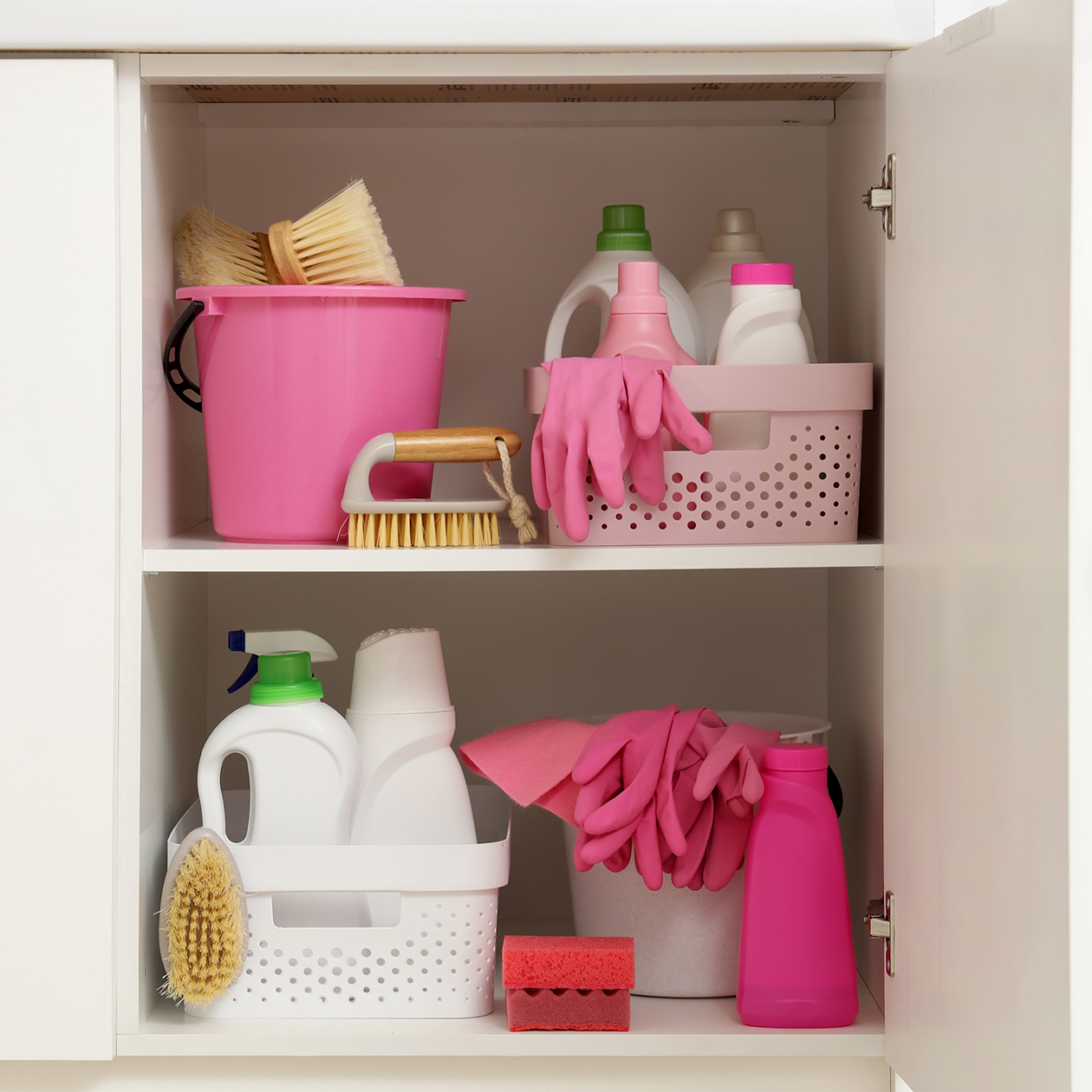 Высокие бутылки можно разместить в более глубокие контейнеры или большие корзины. Бытовую химию стоит убрать на полку повыше, чтобы до нее не добрались дети или животные.