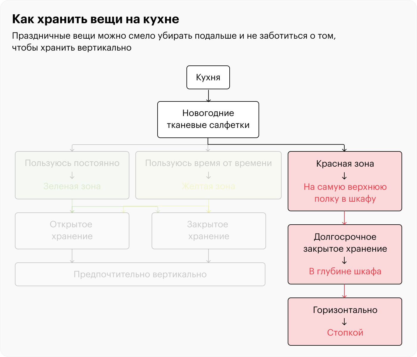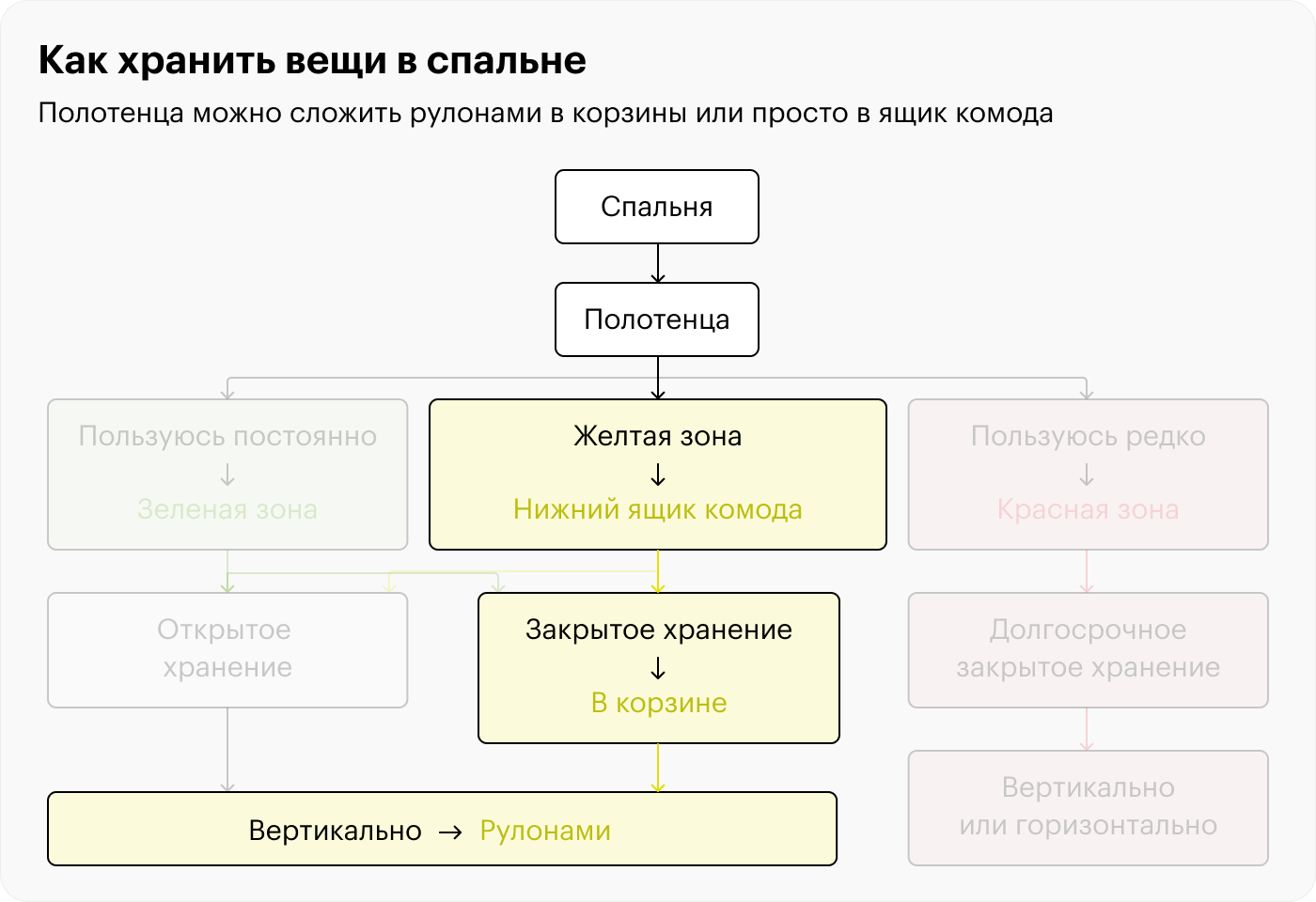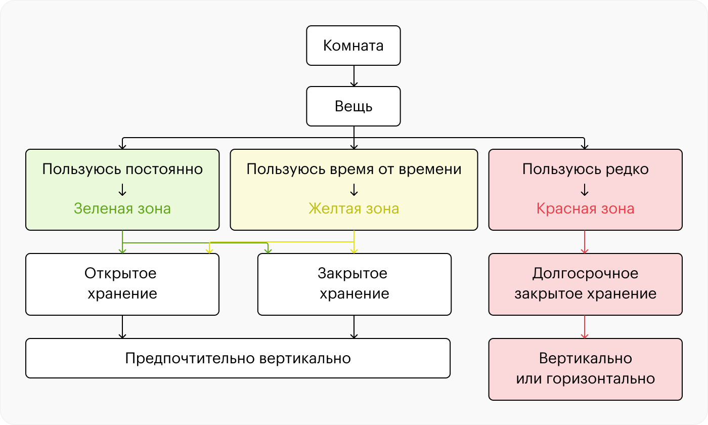 Теперь вы знаете все о хранении. Мы собрали информацию из этого и предыдущего урока в виде блок-схем — используйте их, чтобы подобрать зону и тип хранения для ваших вещей.