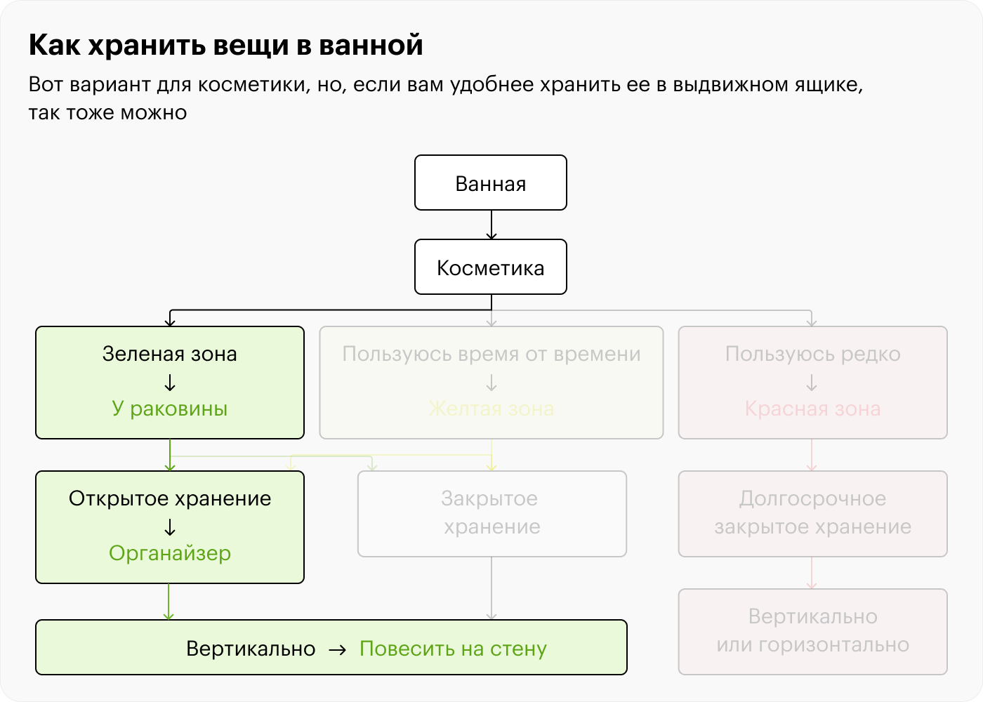 | 🟢 Зеленая | Зубные щетки и пасту, гель для душа, мыло, расческу, дезодорант, косметику — декоративную и уходовую. Освежитель воздуха, туалетную бумагу, повседневную бытовую химию, губки и щетки | Вертикально на стенах или полках | Специальные держатели и органайзеры, стеллажи и полки в ванной |