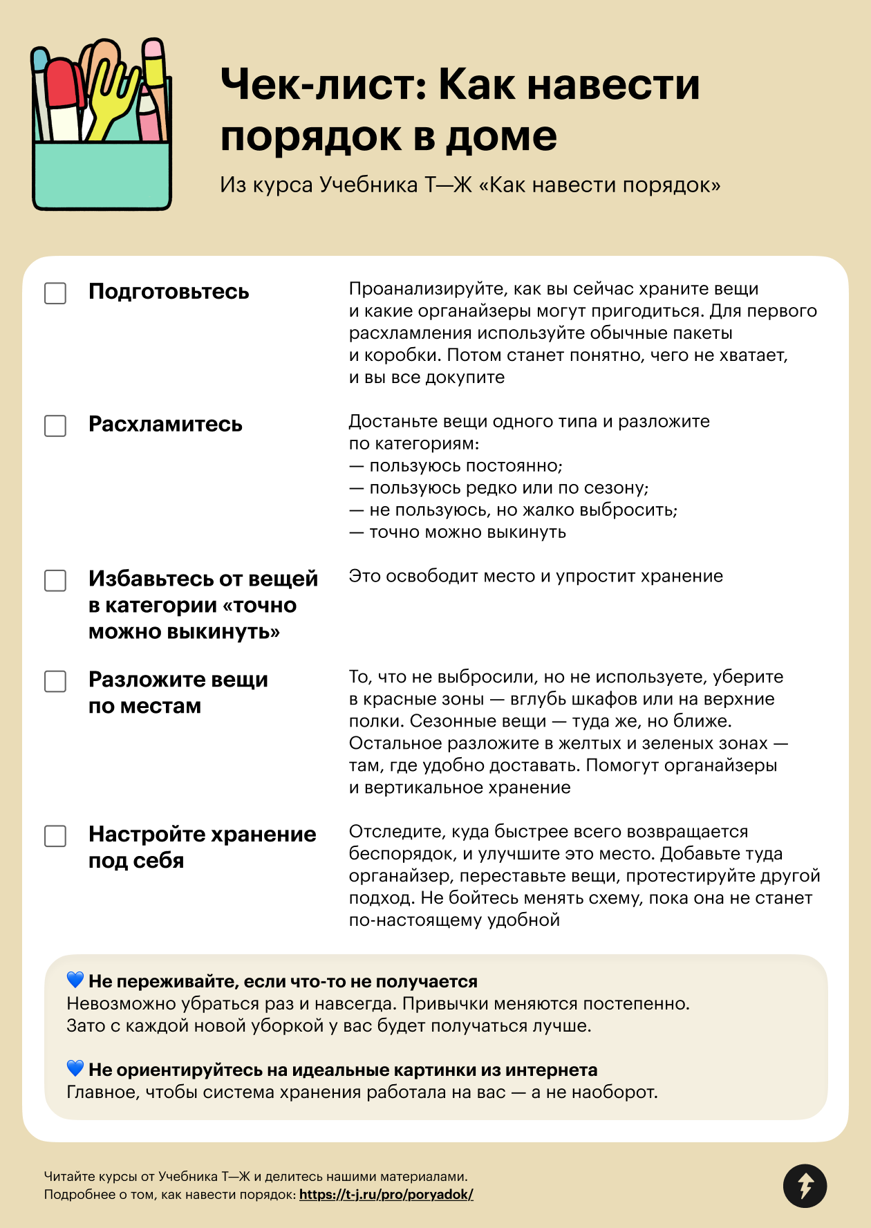 Теперь вы знаете все о том, как навести порядок в доме. Мы собрали основные идеи из четырех уроков курса в чек-листе — забирайте его, чтобы ничего не забыть.