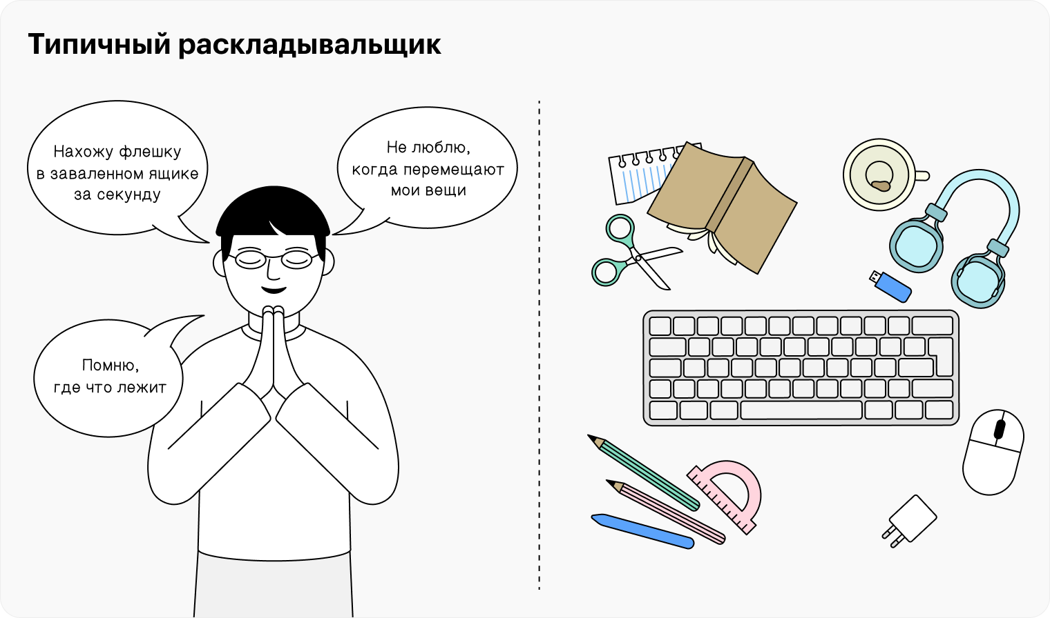 Со стороны может казаться, что на столе хаос, но для раскладывальщика это четкая система. Если кто-то ее нарушит — например, переложит что-то в «правильное» место, — он почувствует раздражение. Его суперсила — вслепую достать нужную бумажку из переполненного ящика.