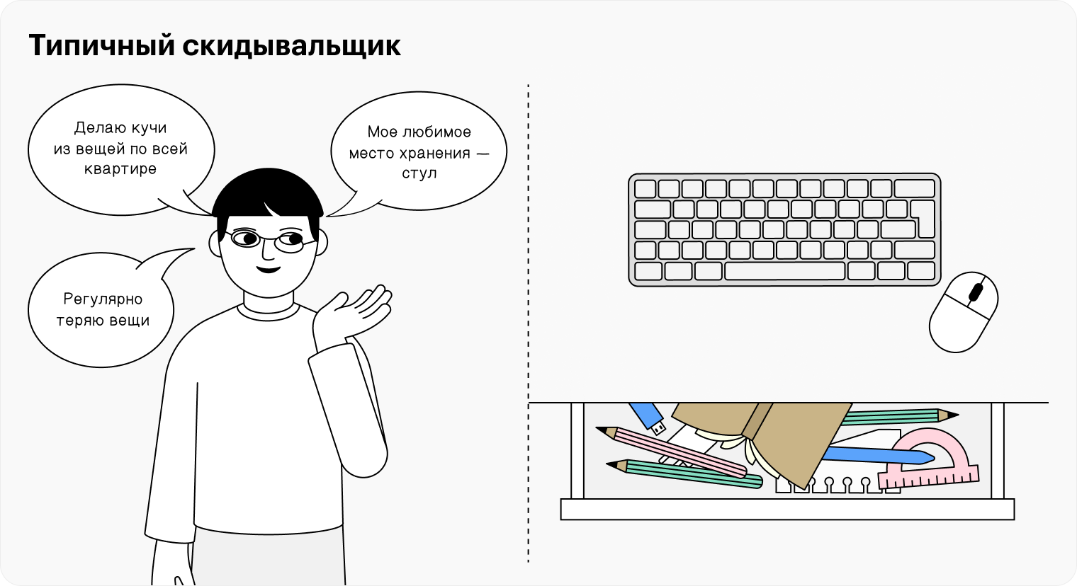 Типичный скидывальщик знает, что вещи нужно класть на место, но на практике действует иначе. На столе у него может быть идеальный порядок, зато в ящике под столом — хаос из ручек, флешек, тетрадей и зарядок. Просто потому, что закинуть все в одно место быстрее, чем аккуратно разложить.