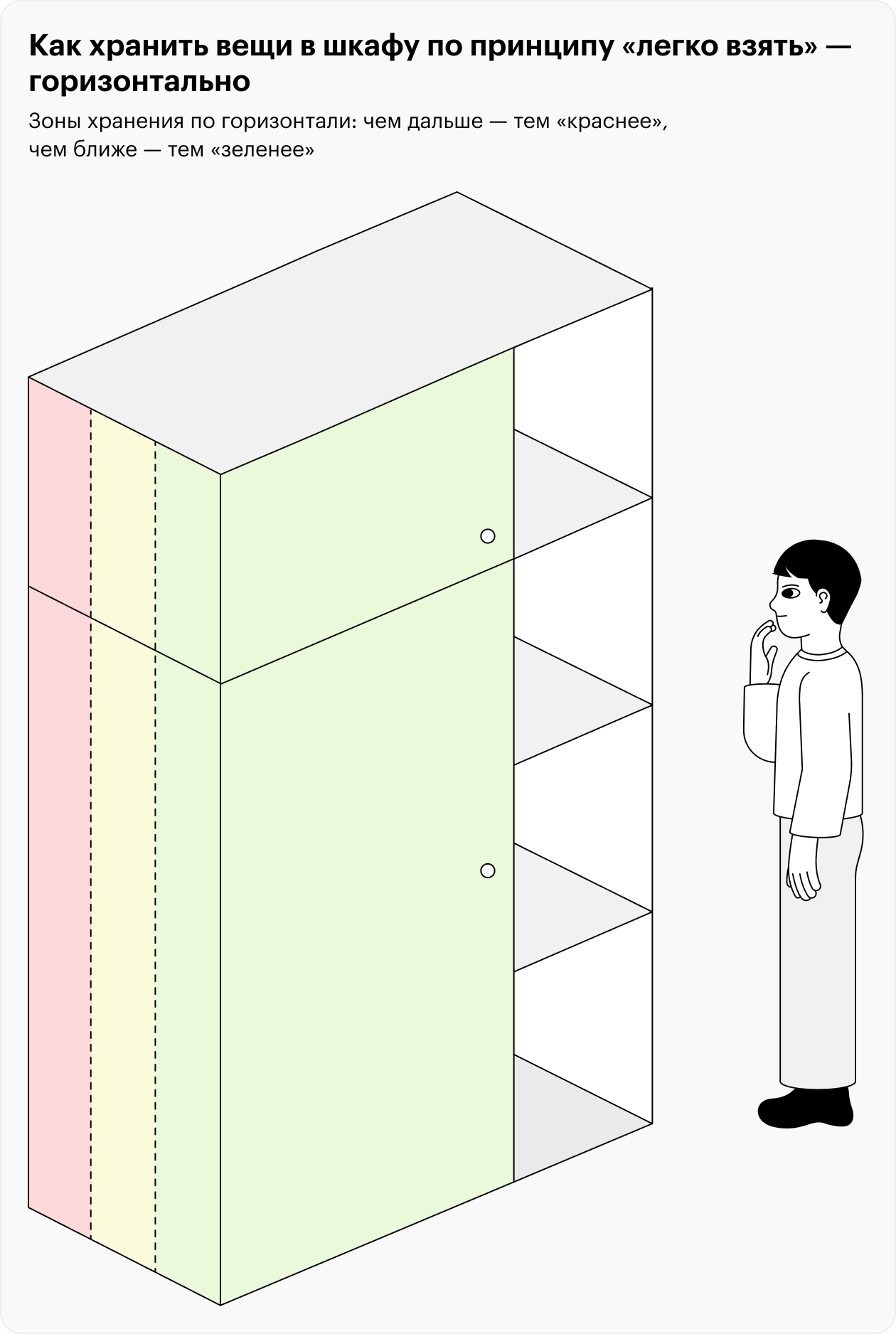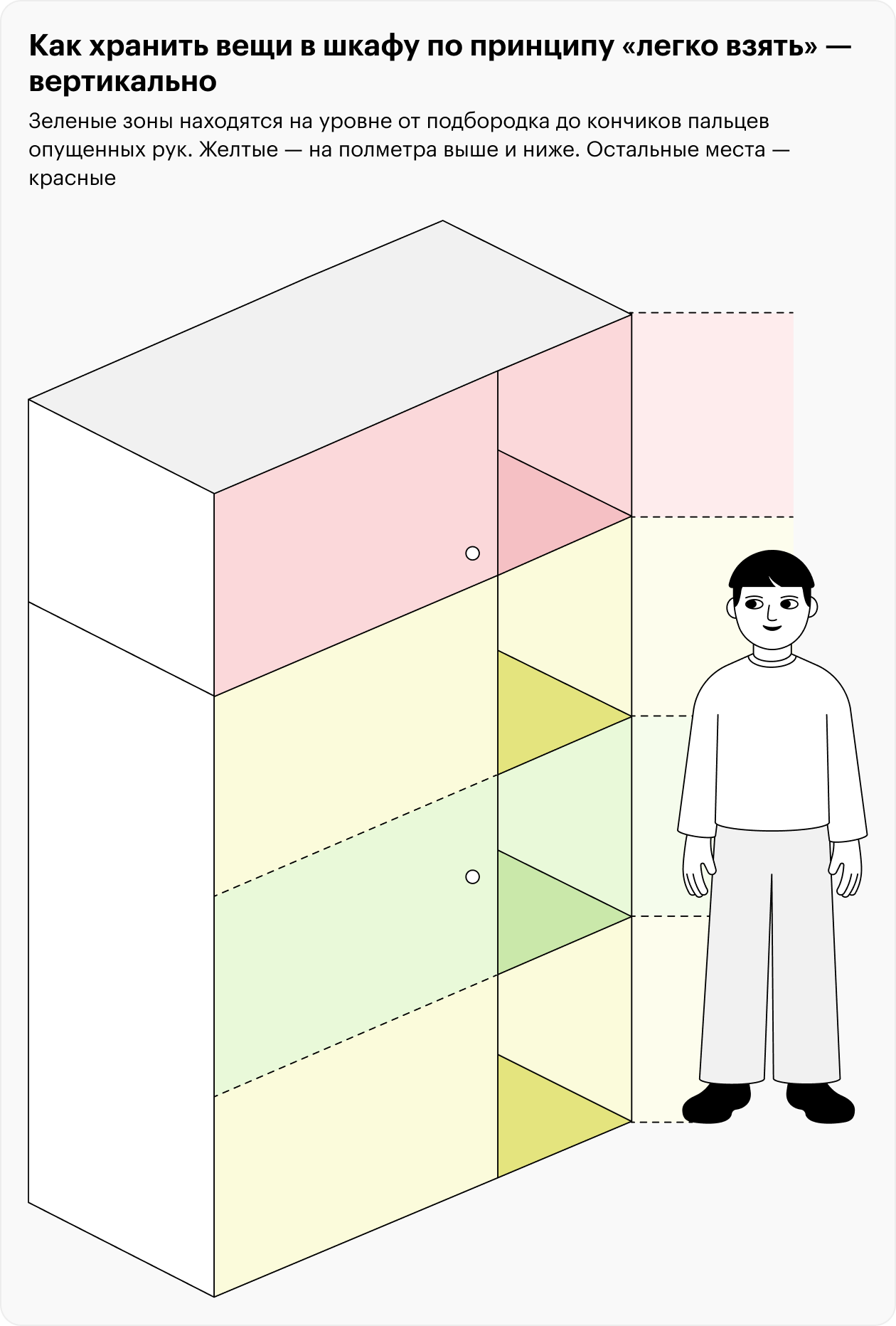 Все остальное разложите в желтых и зеленых зонах дома — там, где вещи удобно доставать и возвращать на место. Используйте вертикальное хранение и органайзеры: так порядок сохранится надолго.