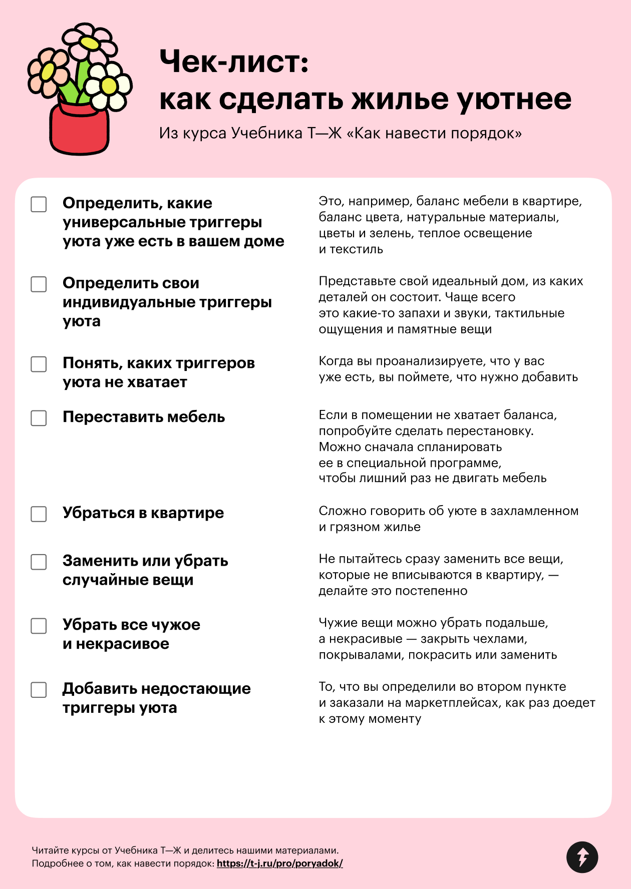 Напоследок собрали для вас чек-лист, который поможет сделать жилье уютнее. Вы можете сохранить его в формате PDF или отправить себе в телеграм-сообщении.