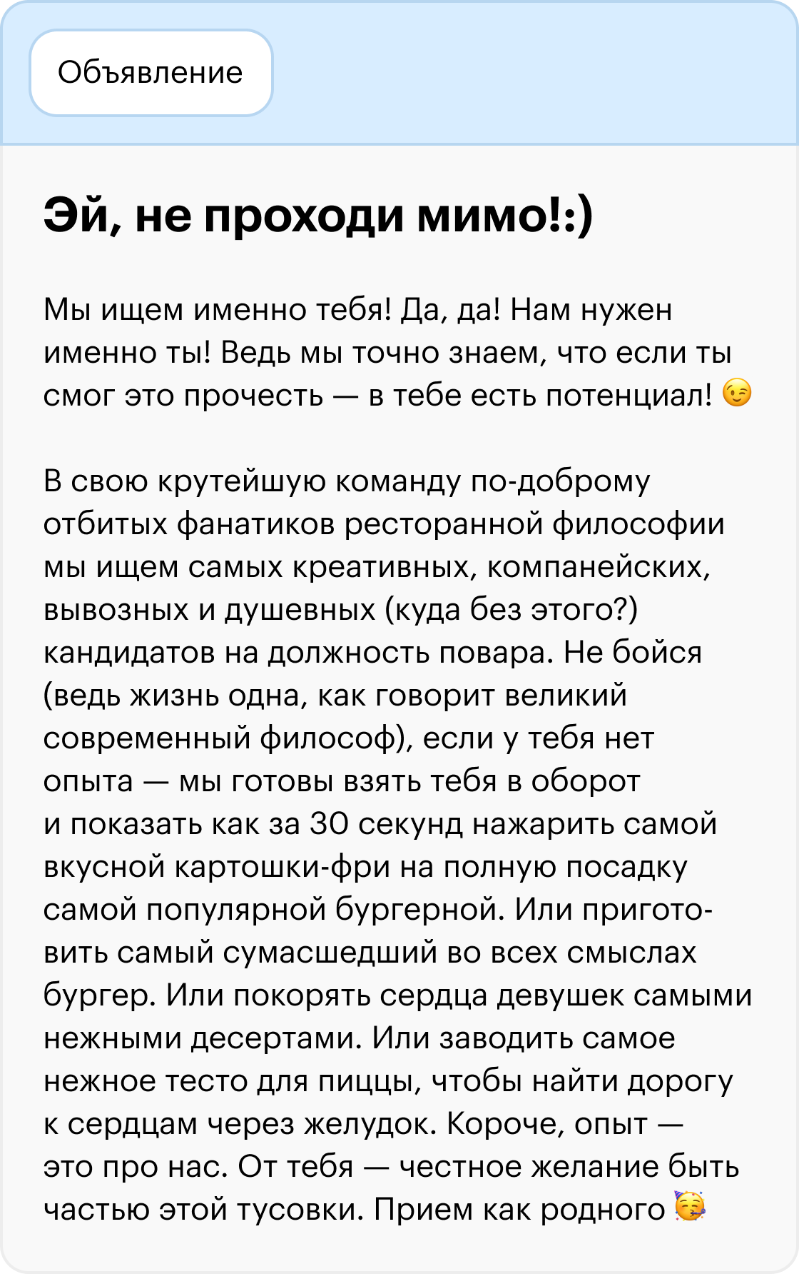 🚨 Вакансия висит очень давно. Если вы натыкаетесь на вакансию уже не первый месяц, скорее всего, ее уже закрыли. Возможно, компания нашла работника, но забыла снять объявление или хочет познакомиться с кандидатами из компаний-конкурентов и так собирает о них информацию.