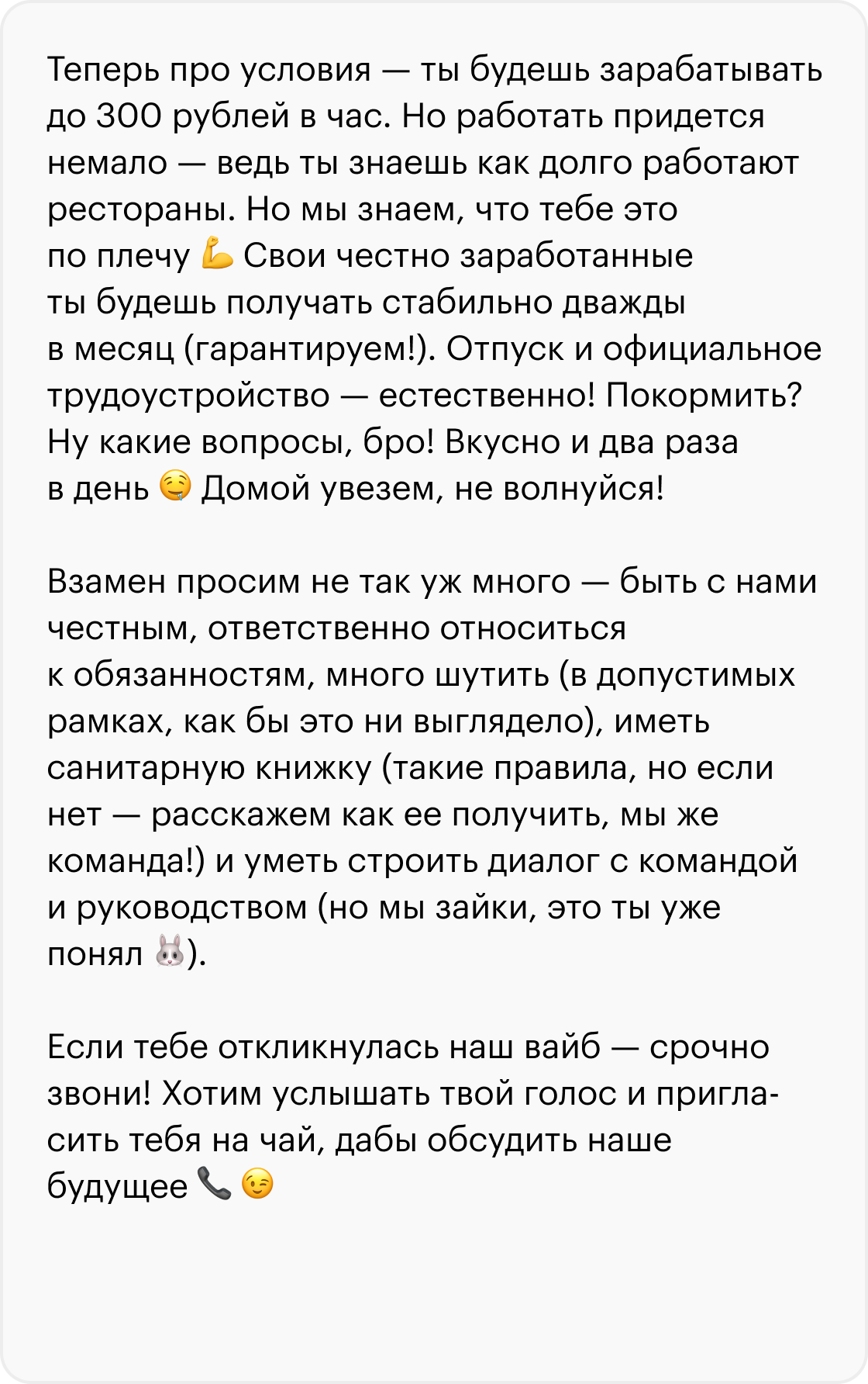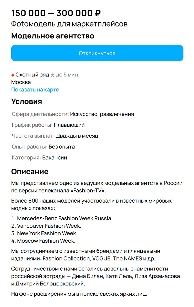 🚨 В вакансии мало конкретики, но много обещаний золотых гор. Обычно в описании таких вакансий не пишут, что именно нужно будет делать, а требования указывают в общих чертах. Например, «офисная работа от 18 до 60 лет», «требуется коммуникабельная девушка для проведения переговоров на высоком уровне».