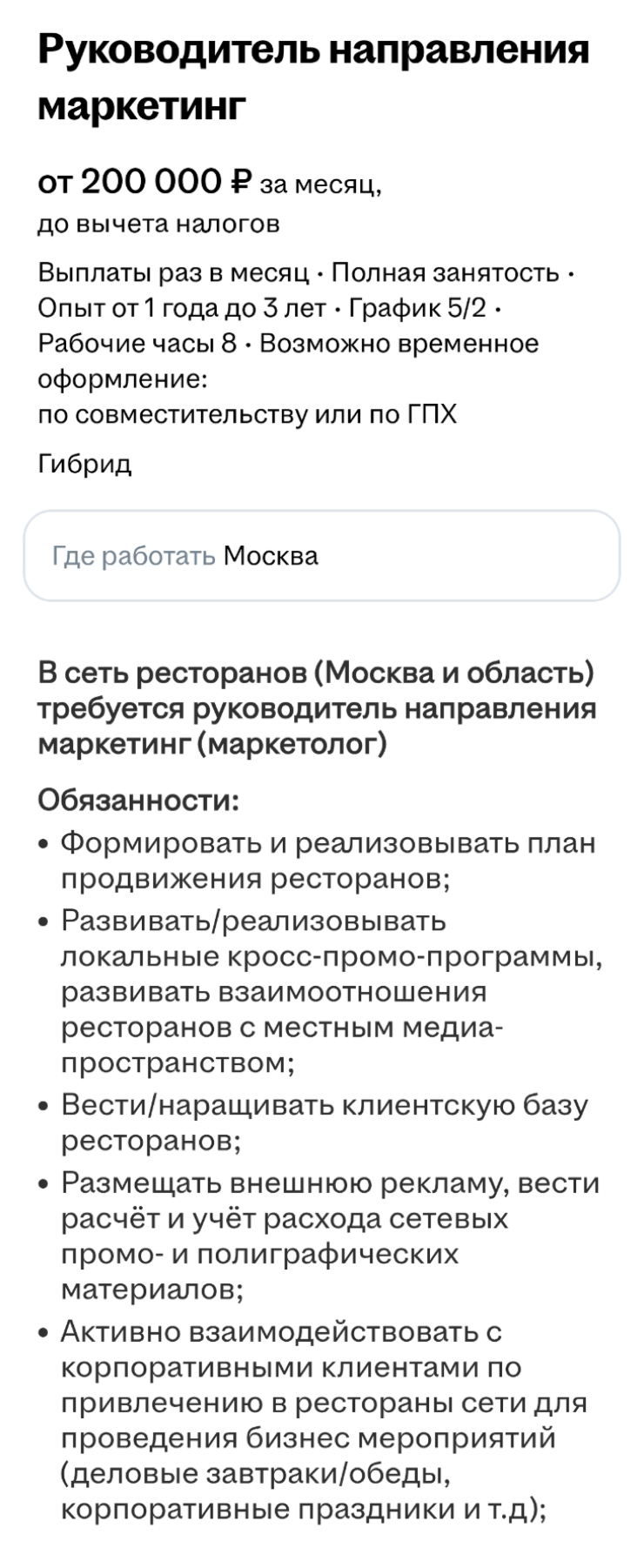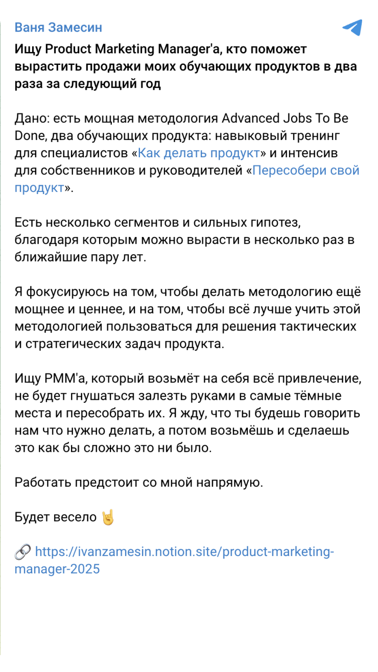 🔹 В компании готовы рассматривать кандидатов с разным опытом. В этом случае вакансию не размещают либо формулируют в общих чертах, чтобы потом открыть ее под конкретного кандидата.