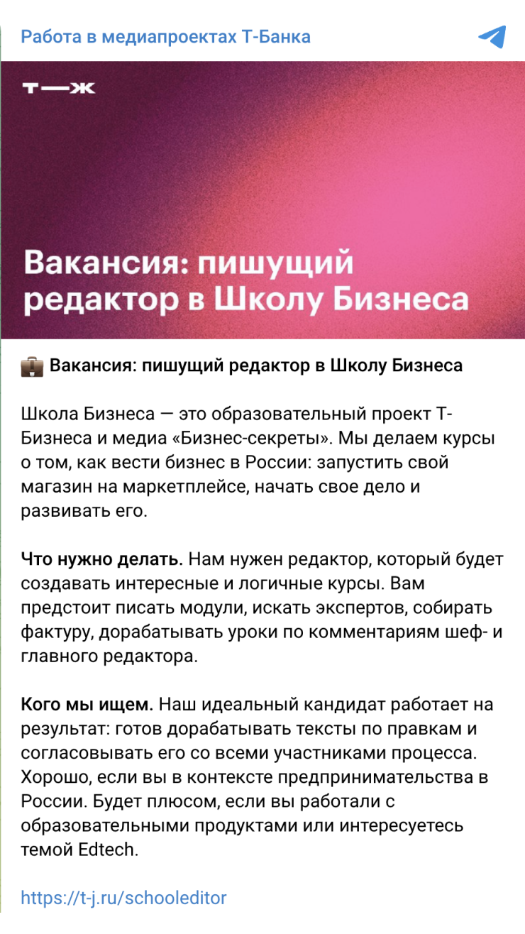 Узкопрофильные сайты и каналы — те, где размещают вакансии для конкретных профессий. Например, на designer.ru публикуют объявления для дизайнеров, на career.habr.com ищут программистов и ИТ-специалистов, а в каналах glvrd_job и Work4writers — копирайтеров и редакторов.