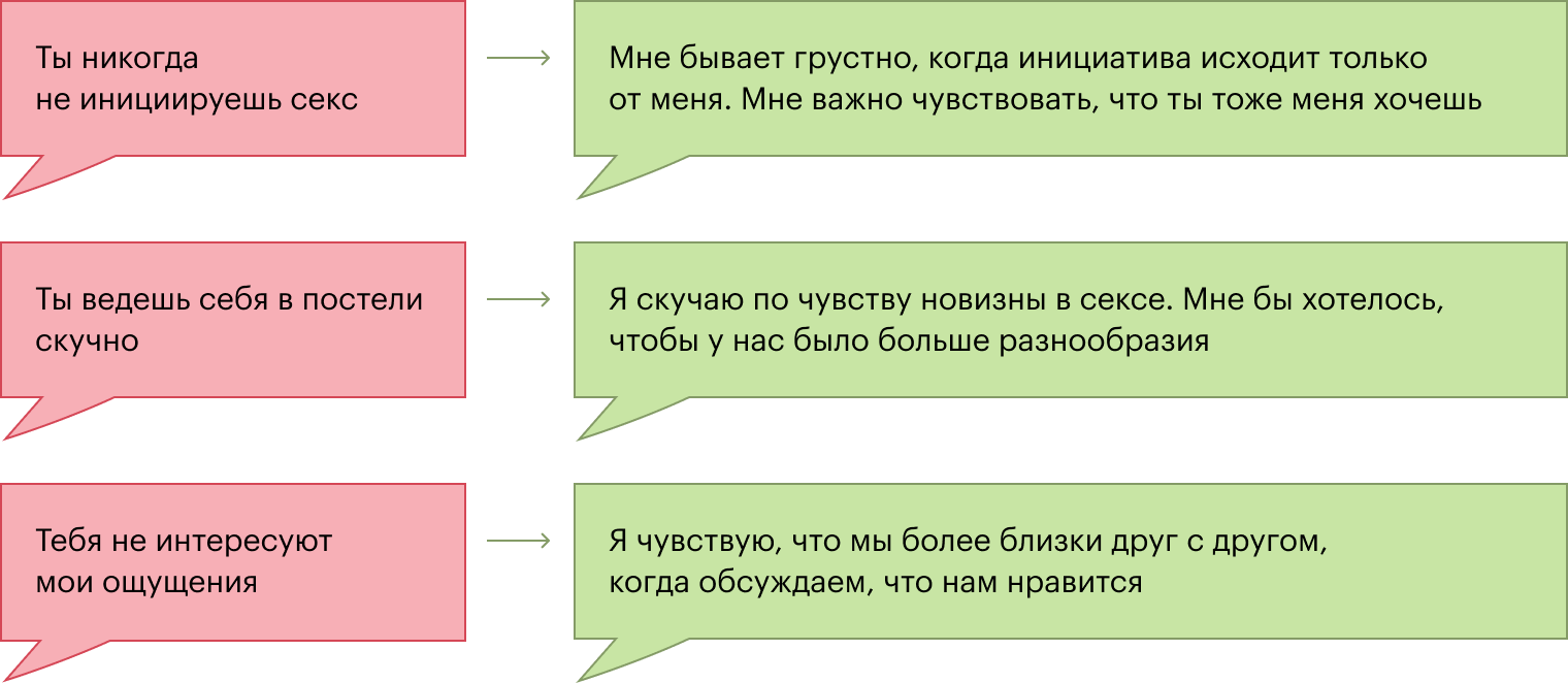 - ✅ «Мне очень тяжело обсуждать секс, когда ты так про себя говоришь. Для меня важно, чтобы мы могли говорить на такие деликатные темы».