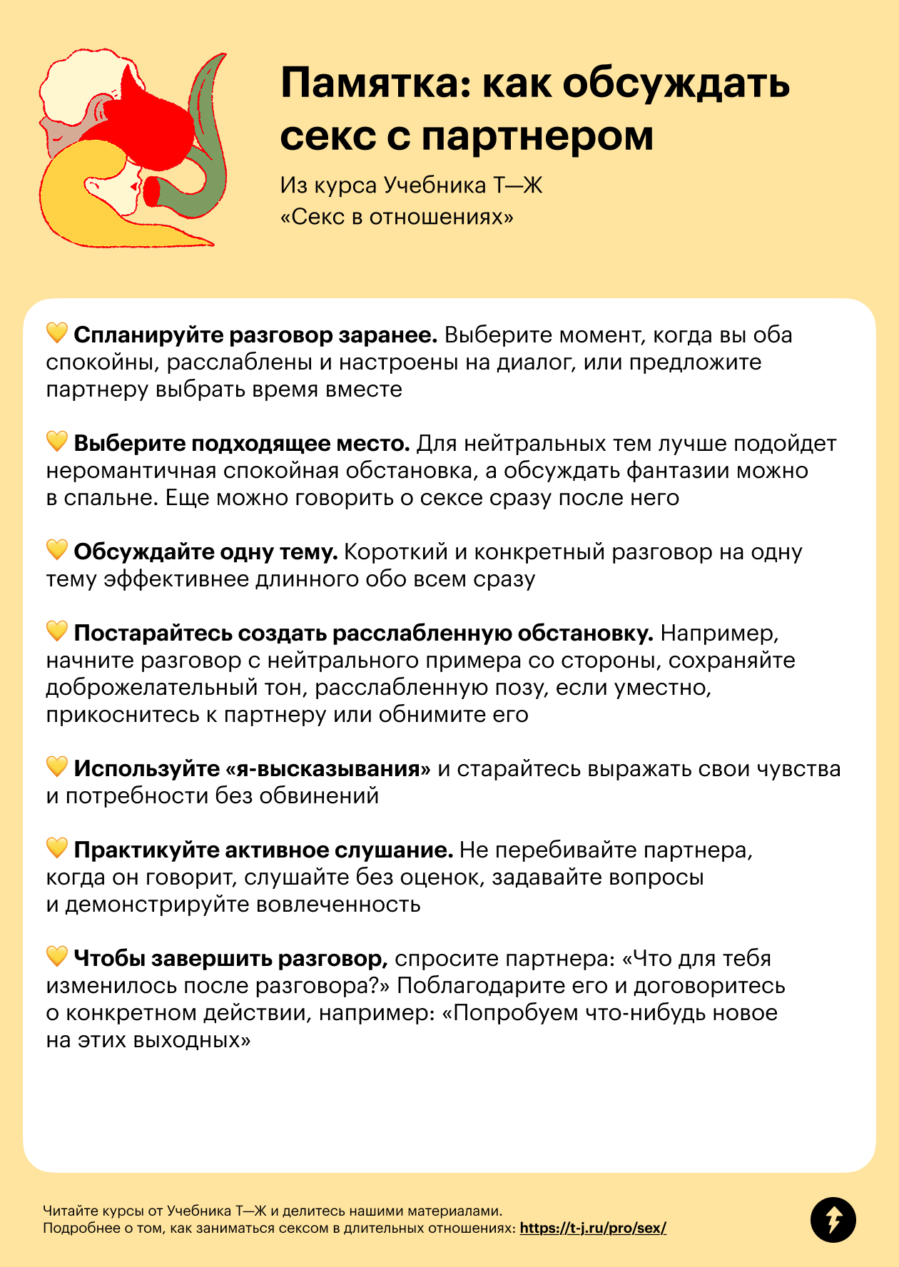 Так как разговор о сексе часто связан с большим количеством разных сложных чувств и эмоций, его важно не только аккуратно начинать, но и бережно завершать. Это поможет сохранить чувство, что вы друг друга правильно поняли и у вас получилось о чем-то договориться.