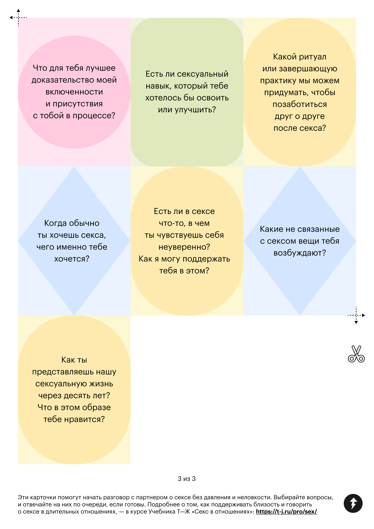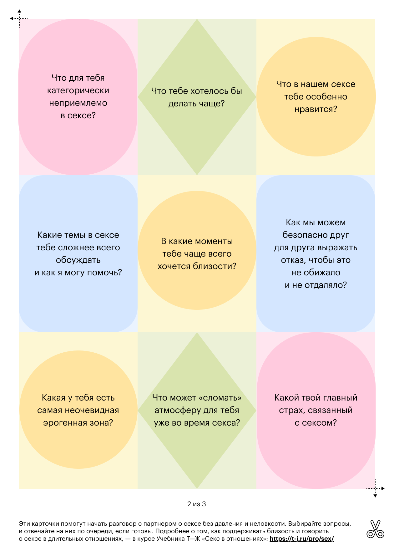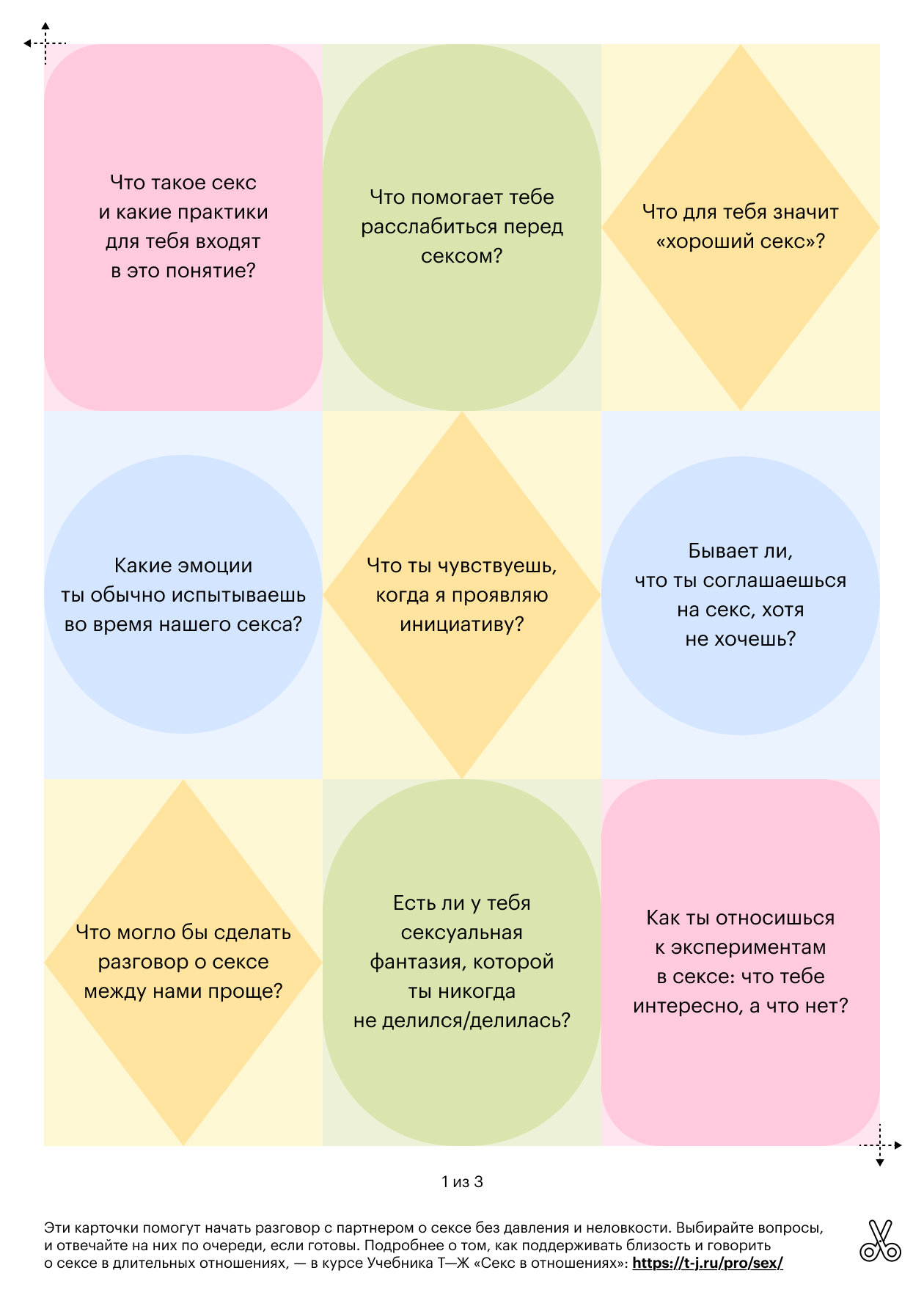 Чтобы вам было проще говорить о сексе прямо, мы придумали карточки, которые могут помочь начать разговор мягко и с любопытством, без давления и неловкости. Используйте карточки как игру: выбирайте те, что вызывают у вас реакцию, или предложите партнеру по очереди отвечать на вопросы.