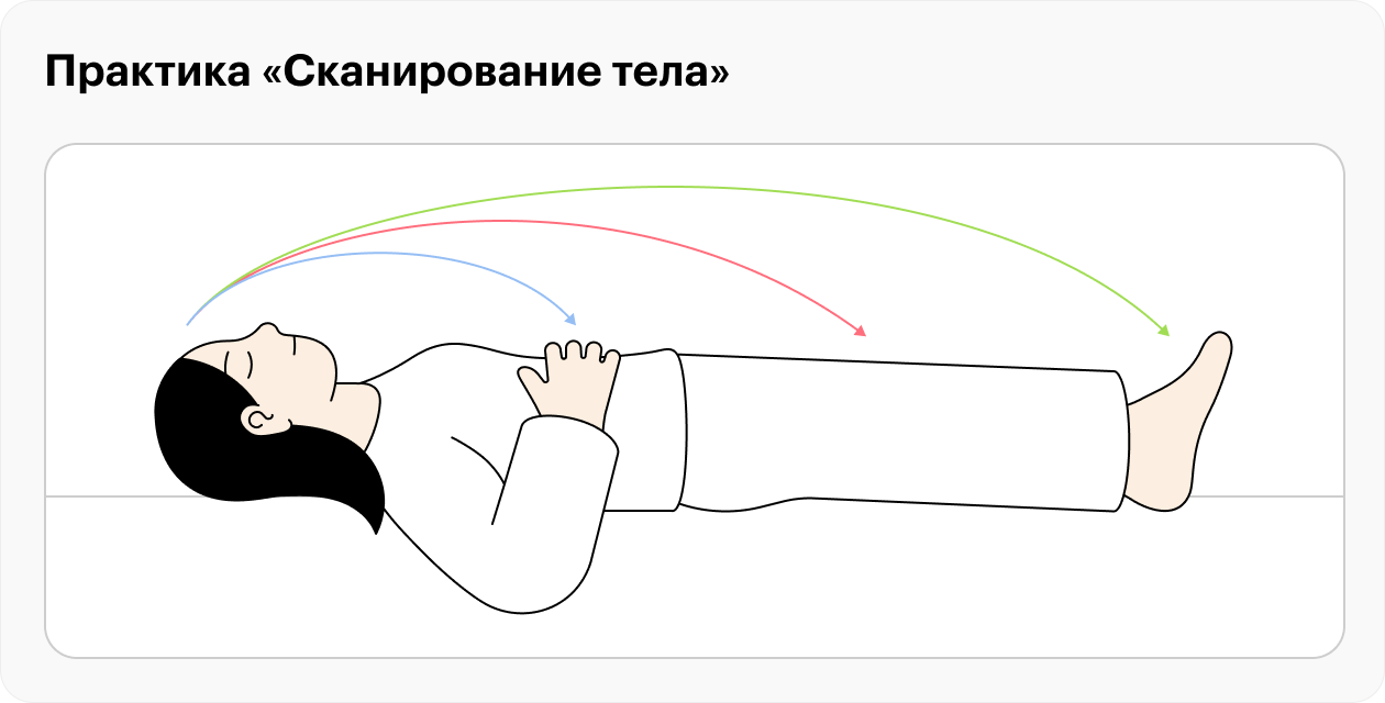 Практика «Сканирование тела». Выполнять практику можно ежедневно, лучше вечером, когда вы завершаете рабочий день или готовитесь ко сну. Достаточно 10—15 минут, чтобы ощутить эффект.