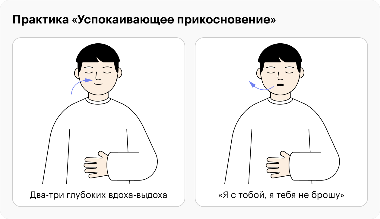 - Мысленно произносите поддерживающую фразу. Например: «Я с тобой», «Я тебя не брошу», «Тебе не нужно быть идеальным, чтобы быть любимым». Если говорить это себе сложно, можно представить образ поддерживающего человека — друга или родственника.