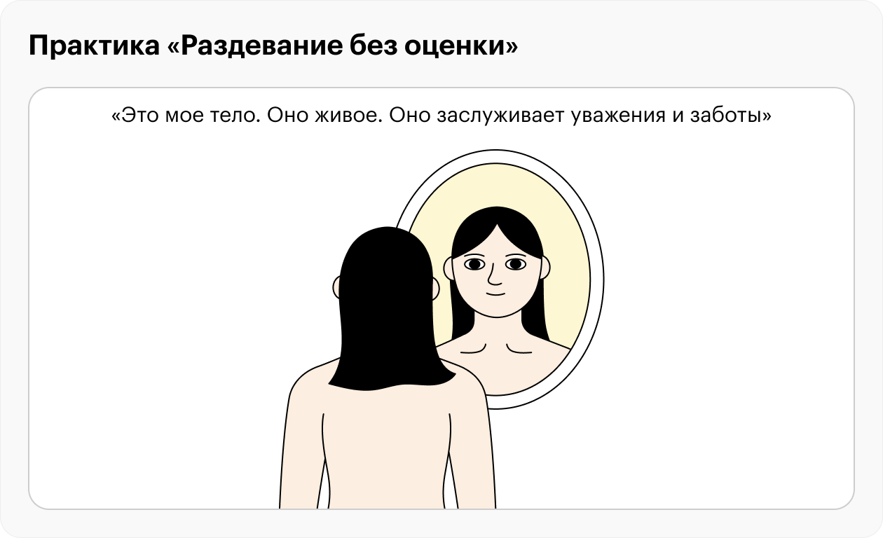 Практика «Раздевание без оценки». Эта практика помогает восстановить спокойный и дружелюбный контакт с телом — без сравнения, стыда и негативных оценок. Выполнять ее можно несколько раз в неделю. Вначале она может вызывать неловкость или смущение, но со временем уровень телесной тревоги и стыда обычно снижается.