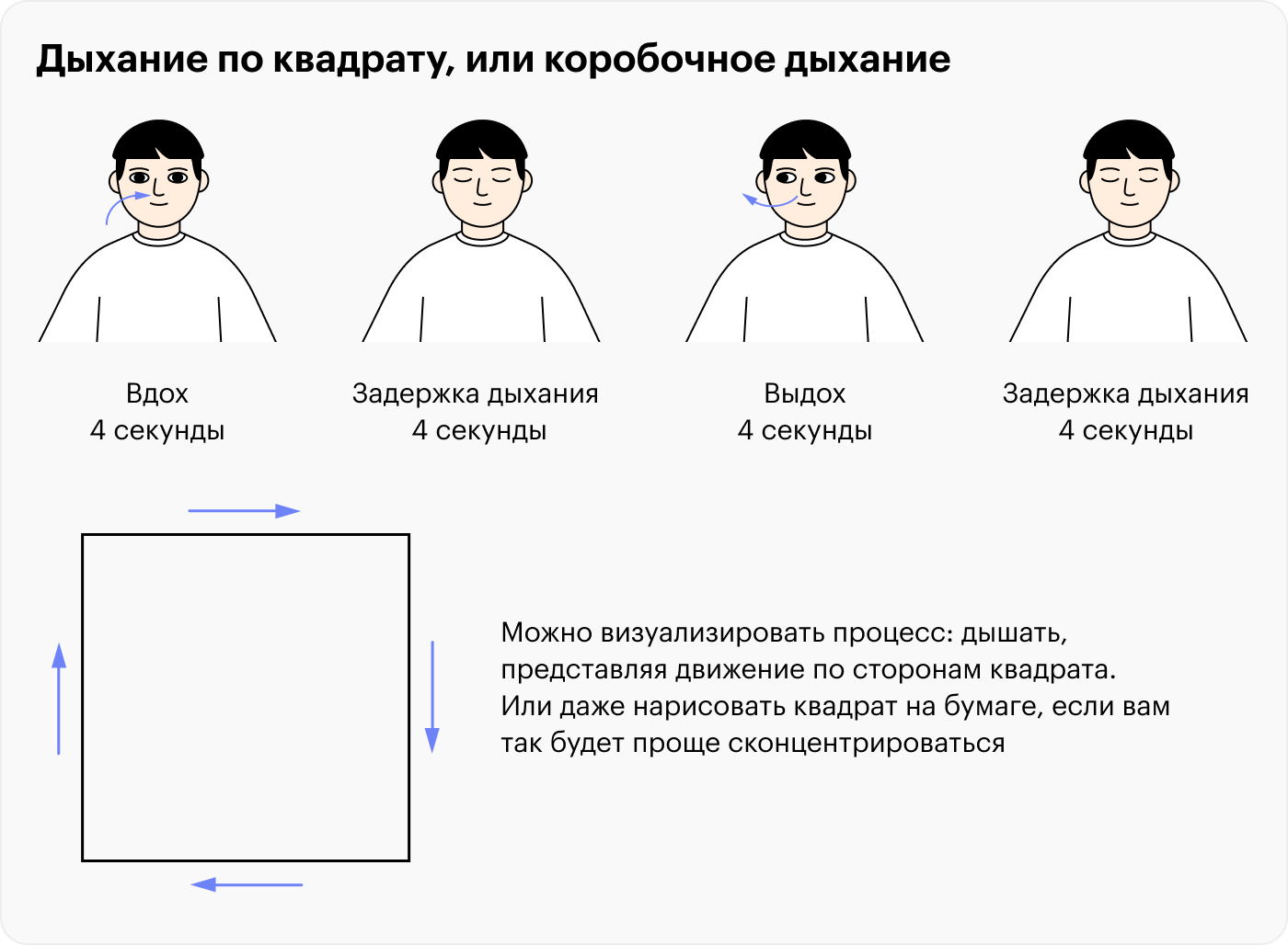 Суть техники — в контроле дыхания и чередовании вдоха, задержки дыхания и выдоха. Вдох длится 4 секунды, задержка дыхания — 4 секунды, выдох — 4 секунды.