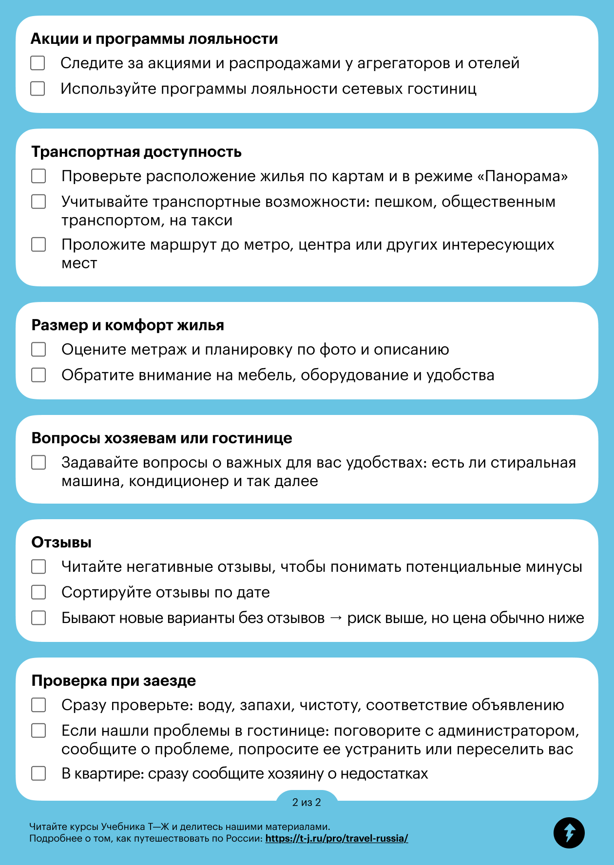 Урок почти закончен. Напоследок собрали для вас памятку по выбору и бронированию жилья в путешествии по России. Вы можете скачать его в формате PDF или отправить себе в телеграм-сообщении.