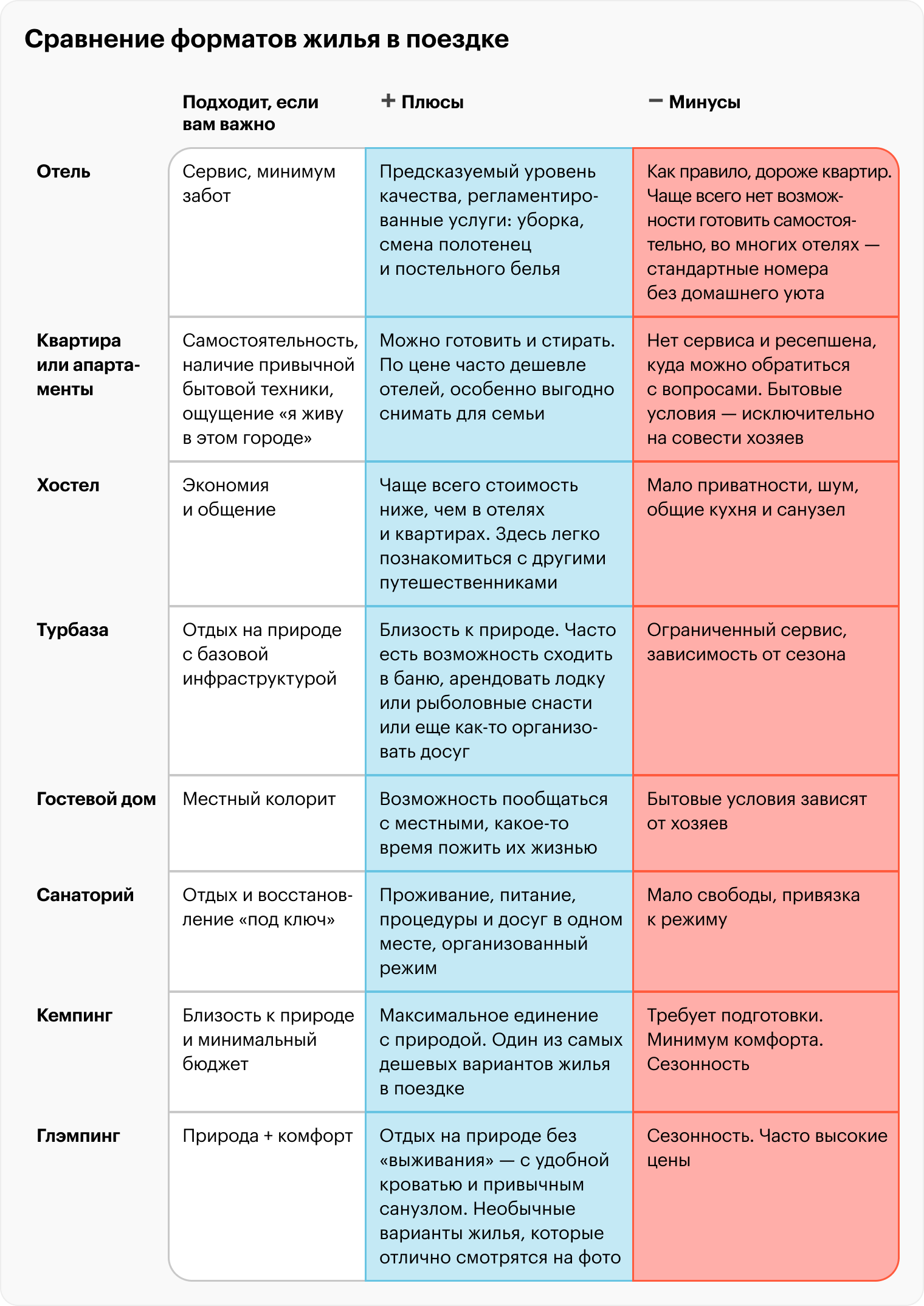 Мы разобрали основные форматы жилья — от отелей и квартир до хостелов, санаториев и глэмпингов. Чтобы проще было сопоставить их между собой, собрали ключевые отличия в сравнительной таблице.