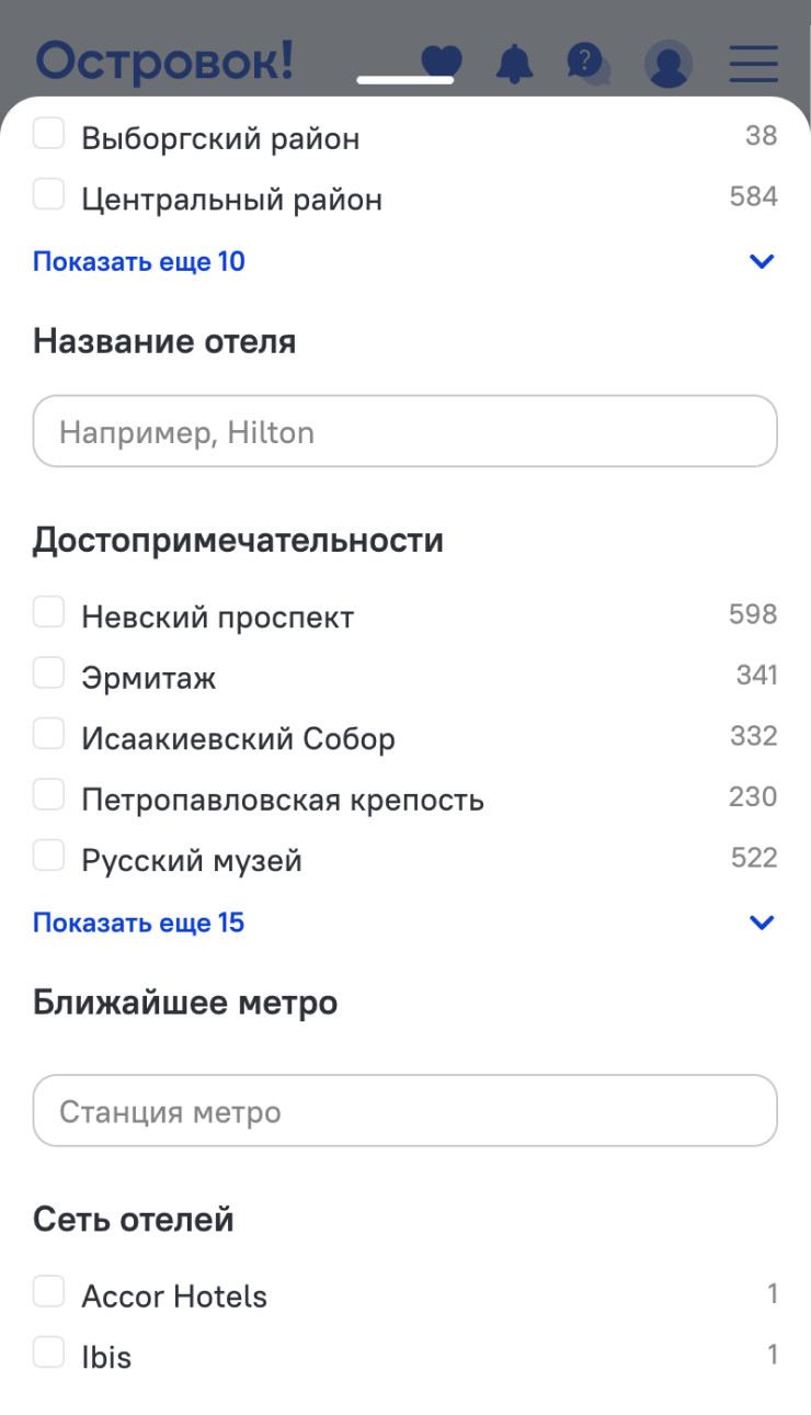 У разных площадок интерфейс и система поиска отличаются: где-то фильтров больше, где-то меньше. Один из наиболее гибких вариантов — «Островок». Например, там можно отфильтровать жилье по расположению рядом с конкретными достопримечательностями или станциями метро.