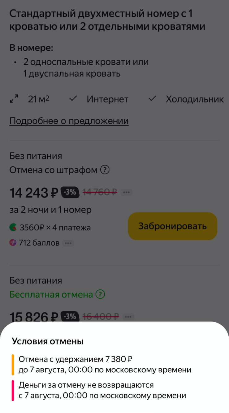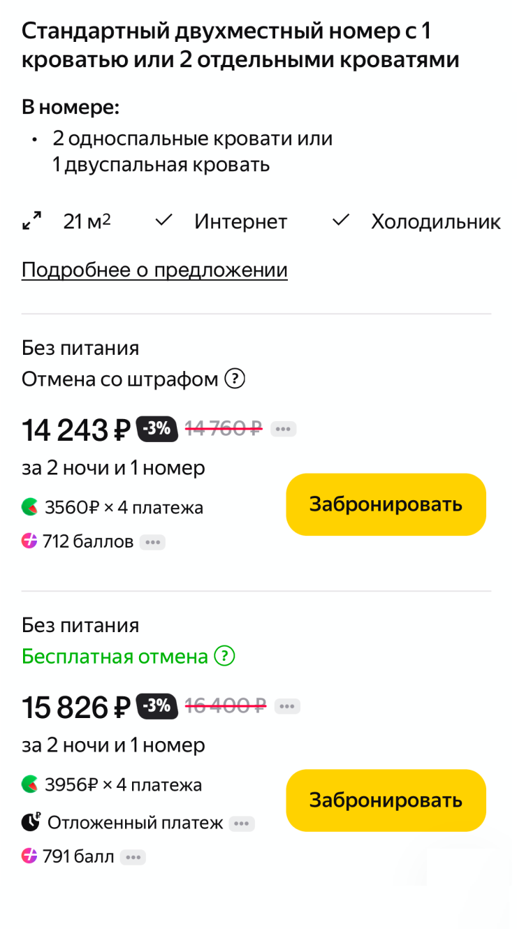А еще стоит сравнить цены между категориями номеров. Бывает, что за завтрак просят 2 000 ₽, а в номере классом выше он бесплатный — и разница в стоимости равна тем же 2 000 ₽.